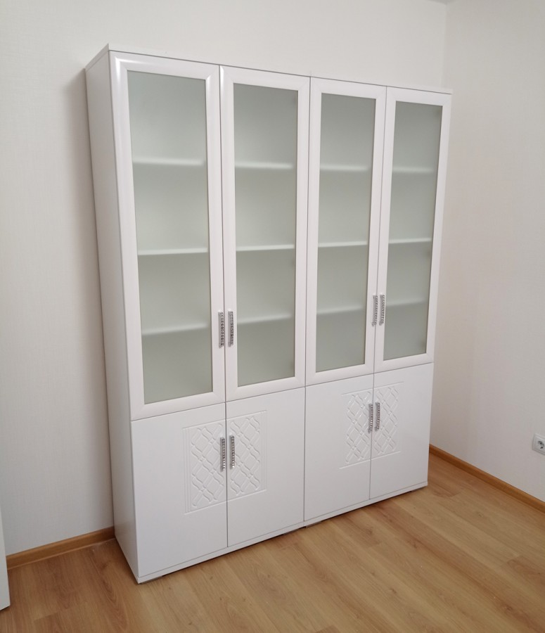 Вместительный модуль для хранения книг. Верхняя секция закрыта рамочными фасадами с матовыми стеклами Сатин.