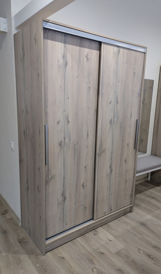 Продуманное внутреннее наполнение шкафа состоит из стеллажа для белья и стационарной штанги длиной 725 мм. На ней поместится как минимум 10 плечиков с верхней одеждой. Зеркальная дверца с обратной стороны проклеена специальной защитной пленкой, которая предотвратит от падения осколков, если она разобьется. В изготовлении шкафов-купе STRIKE использована прочная стальная система треков «Найди» цвета Металлик. Двери шкафов дополнены ручками из массива и шлегелем, который смягчает удары дверей при закрывании, а также защищают вещи от попадания пыли. Благодаря скрытым полкодержателям полки жестко крепятся на необходимой высоте.