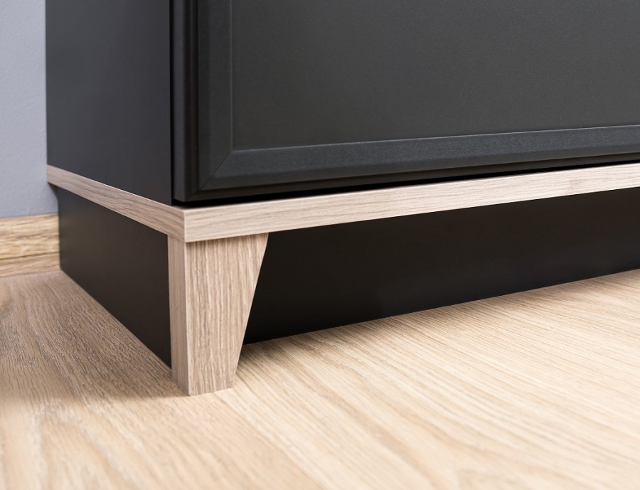 Изысканность стиля подчеркивает тонкий фигурный профиль на фасадах, верх и низ модулей выполнены в древесном декоре, а скошенные опоры из МДФ добавляют мебели в стиле неоклассика из коллекции AURELIO нотку современной эстетики. Петли с доводчиками - для комфортного открывания / закрывания дверок шкафа. Задняя стенка шкафа в древесном декоре устанавливается в паз, поэтому выглядит аккуратно со всех сторон.