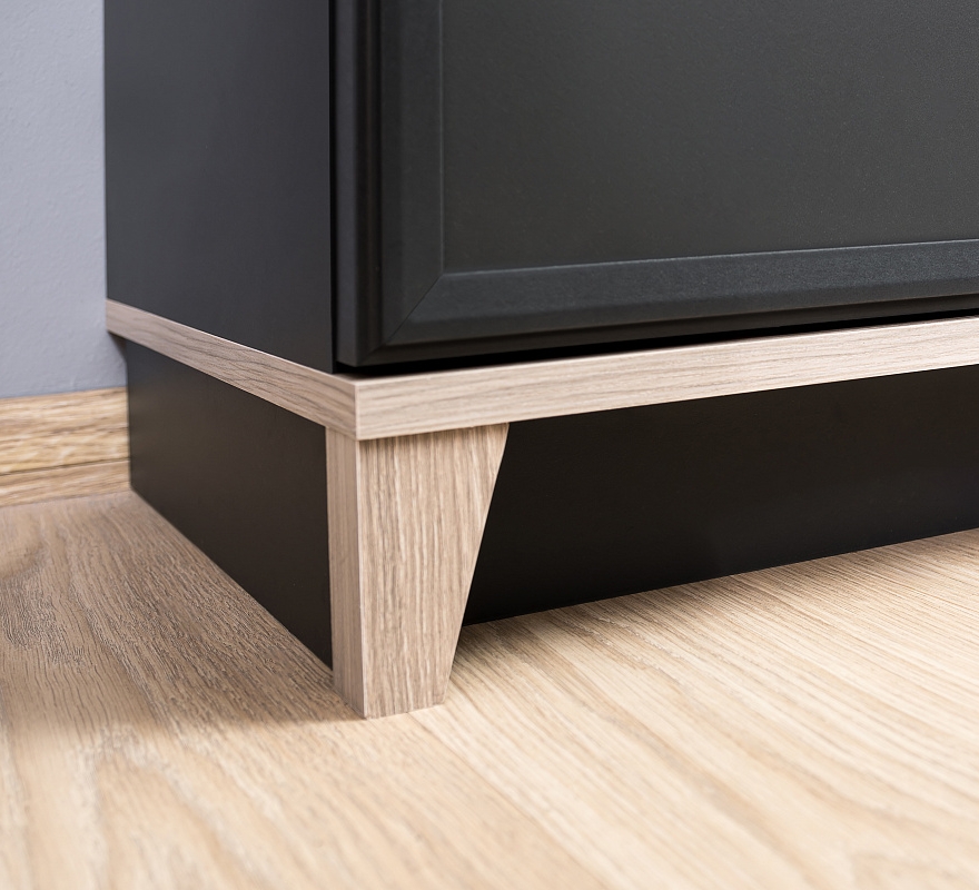 Изысканность стиля подчеркивает тонкий фигурный профиль на фасадах, верх и низ модулей выполнены в древесном декоре, а скошенные опоры из МДФ добавляют мебели в стиле неоклассика из коллекции AURELIO нотку современной эстетики. Петли с доводчиками - для комфортного открывания / закрывания дверок шкафа. Задняя стенка шкафа в древесном декоре устанавливается в паз, поэтому выглядит аккуратно со всех сторон.
