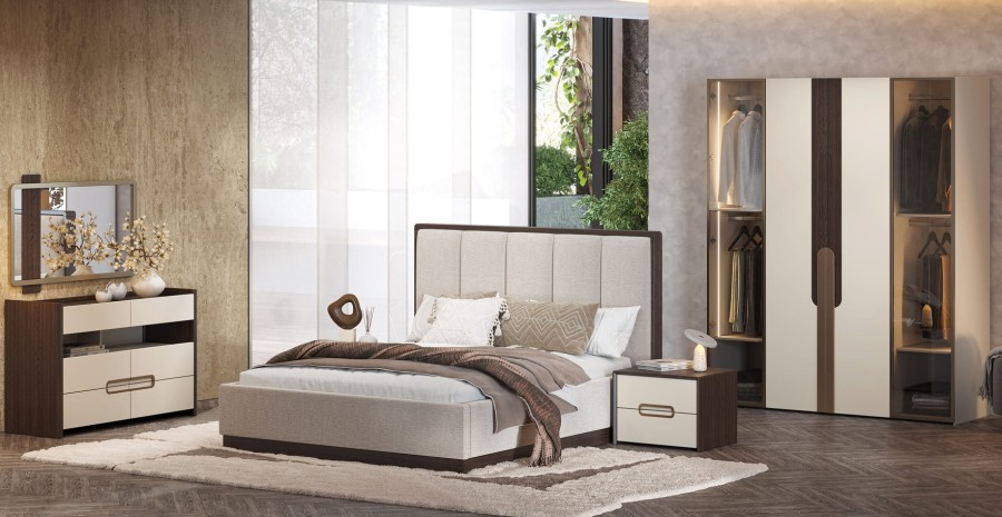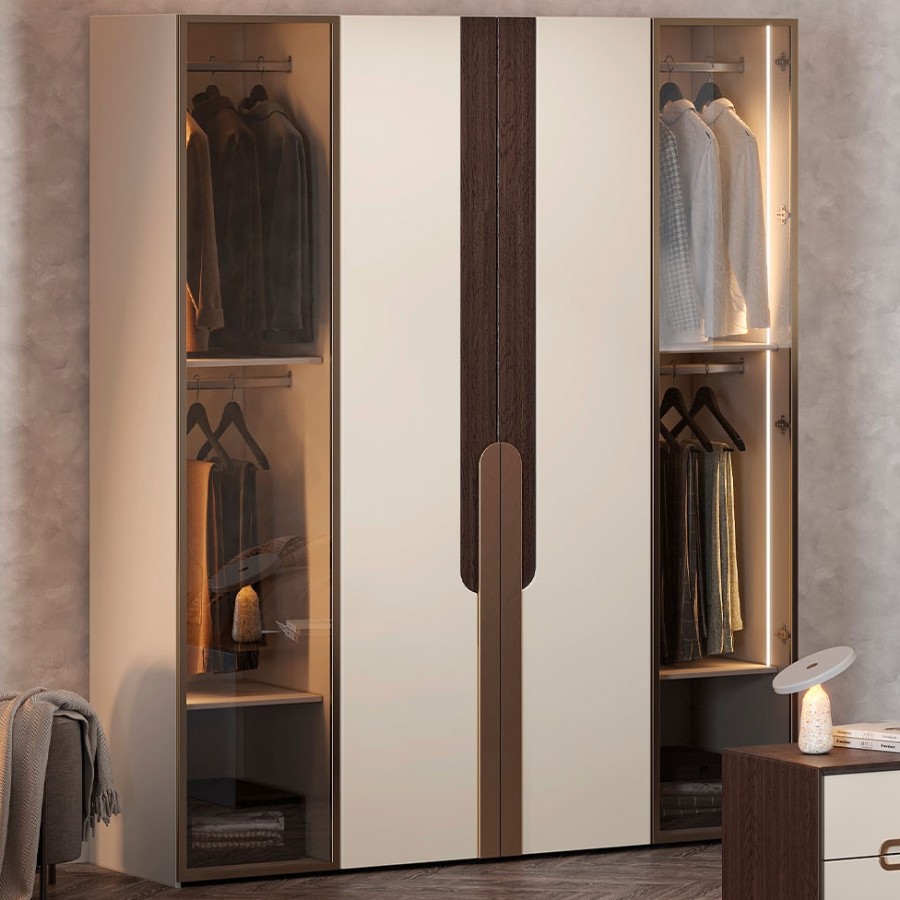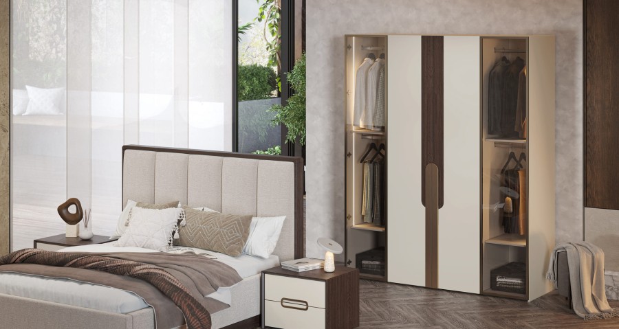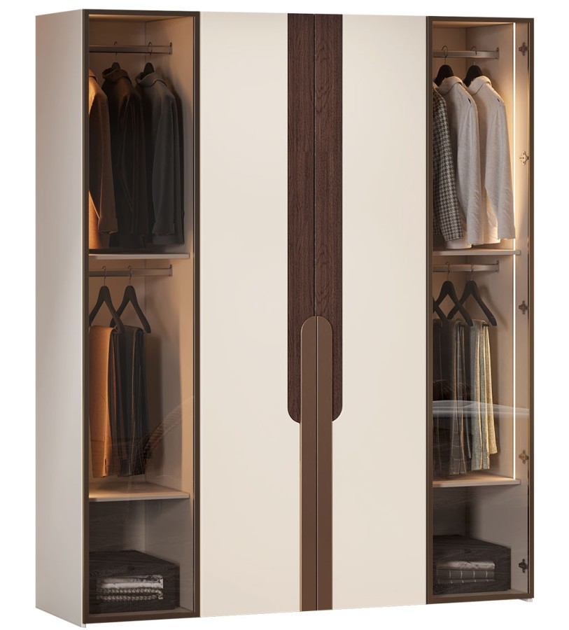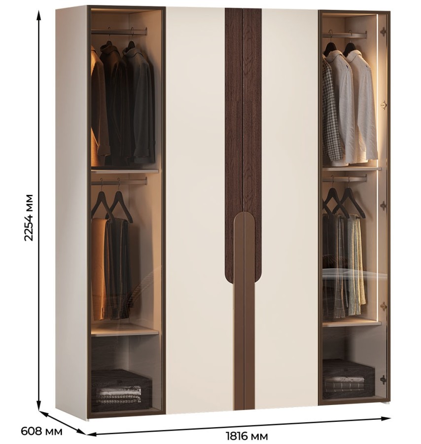 - Фасад МДФ толщиной 22 мм (МДФ - древесноволокнистая плита среднего уровня плотности, класс E1 - безопасен для здоровья). Тонированное стекло в алюминиевой рамке золото. Цвет фасадов: венге/крем, венге/серый кашемир.