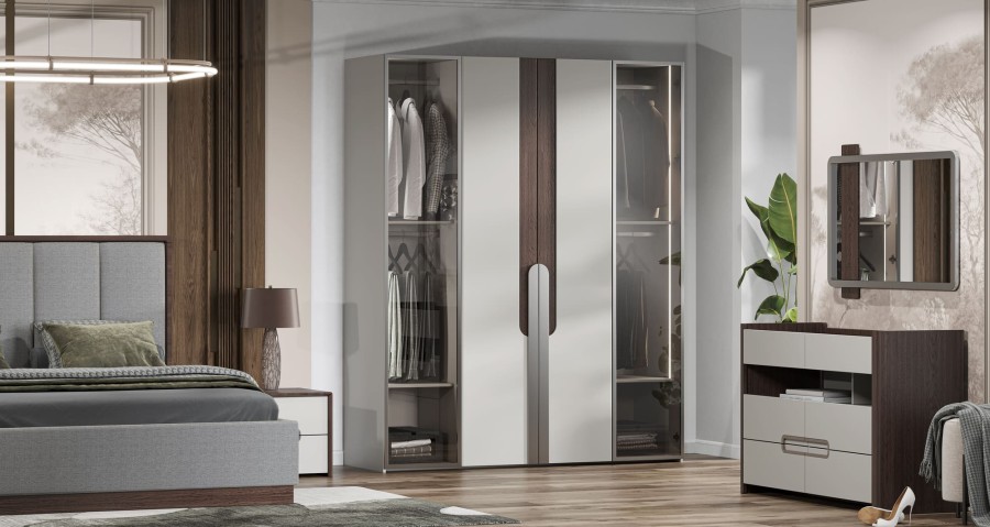 Шкаф "Диана" — это стильное и функциональное решение для вашего интерьера, сочетающее современные материалы и изысканный дизайн.Фасады шкафа выполнены со стеклом в алюминиевой рамке, что придает мебели современный и легкий вид. Этот элемент добавляет визуальной легкости и позволяет интегрировать шкаф в различные стили интерьера.Фасады с декором под дерево венге и вертикальной ручкой со скругленным краем — это тихая симфония контрастов: глубокая, почти таинственная текстура древесины встречается с изящной, плавной линией ручки.