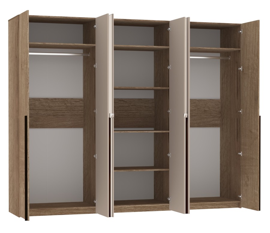 Шестидверный шкаф для одежды и белья с зеркалами — находка для спальни любых габаритов. Продуманное внутреннее наполнение шкафа делает его поистине универсальным. Шкаф оснащен отделениями для хранения белья с регулируемыми по высоте полками и отделением для одежды со стационарной штангой.