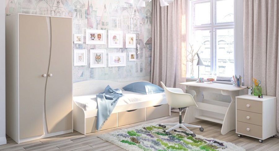 Мебель для молодежной комнаты Комби выполнена в приятных кремово-кофейных тонах, с сочетанием светлой фактуры дерева корпуса и матовых однотонных фасадов цвета «Капучино», что добавит теплоты и уюта в Ваш интерьер.