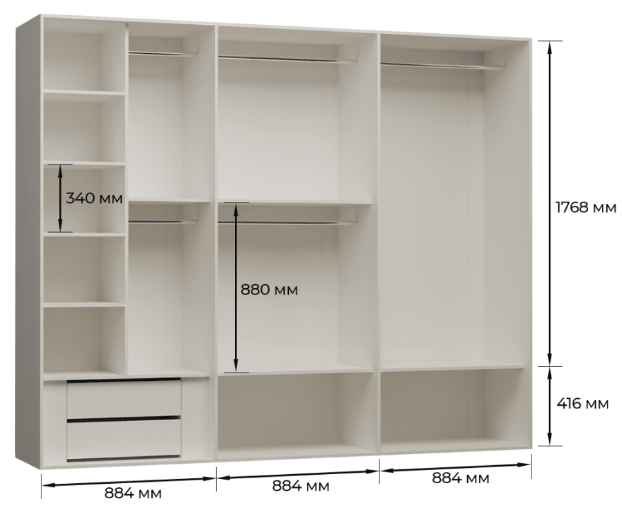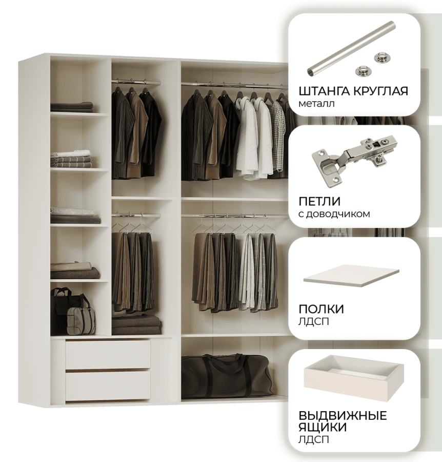 - Полки ЛДСП толщиной 16 мм (ламинированная древесно-стружечная плита, класс E1 - безопасен для здоровья).