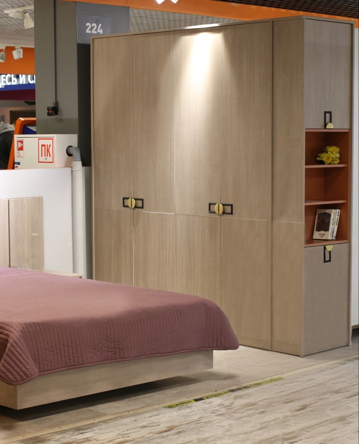 - Внутреннее наполнение: Петли с доводчиками, направляющие скрытого монтажа частичного выката с доводчиком, полки и штанги.
