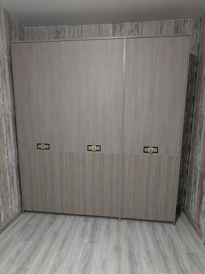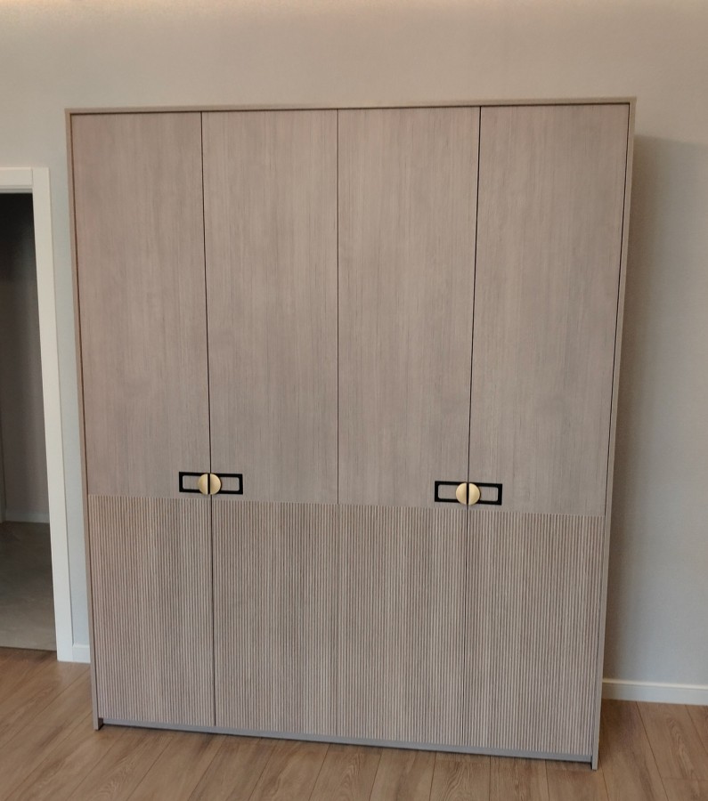 - Внутреннее наполнение: Петли с доводчиками, направляющие скрытого монтажа частичного выката с доводчиком, полки и штанги.
