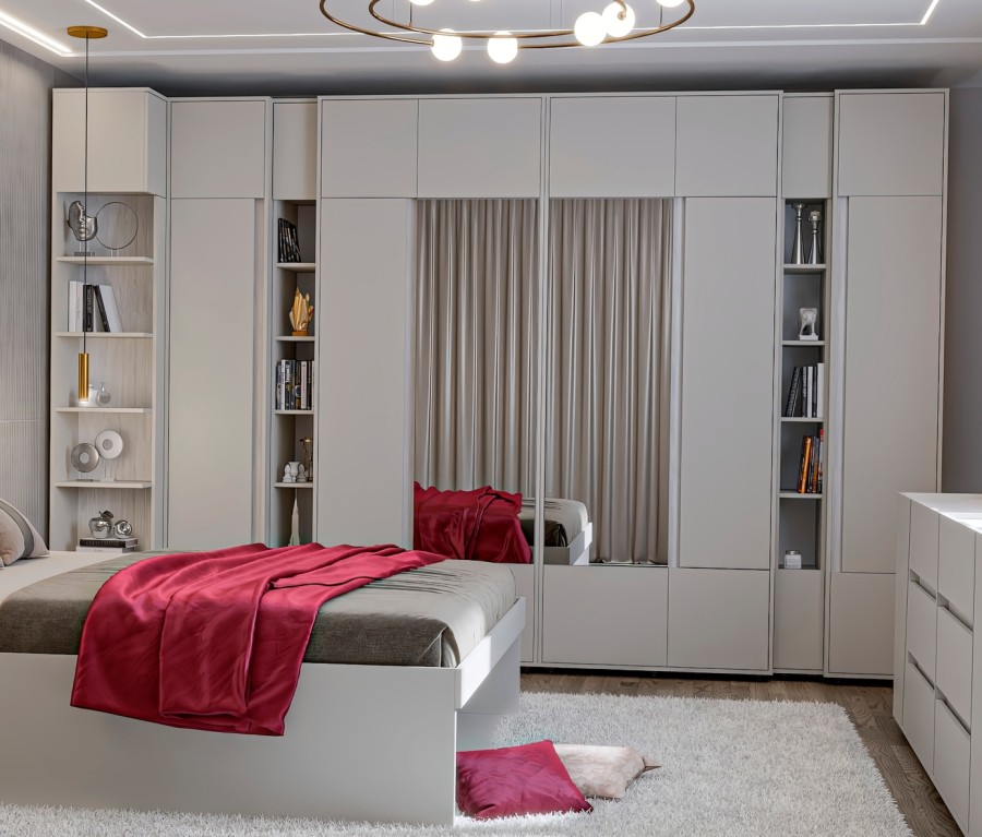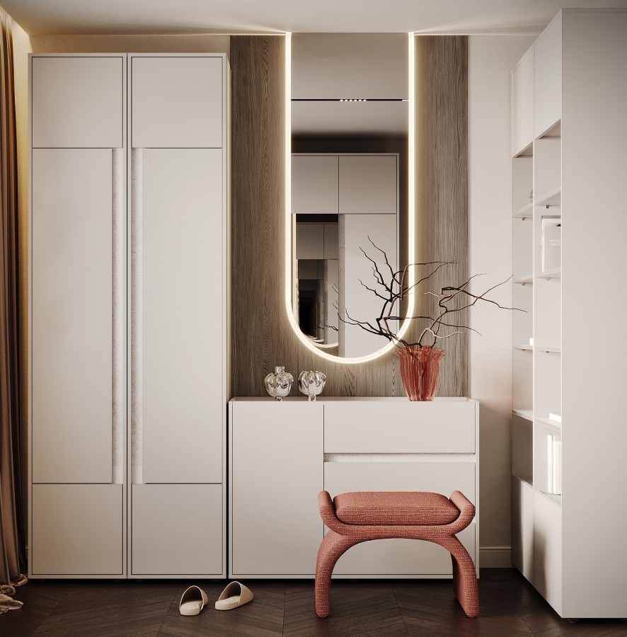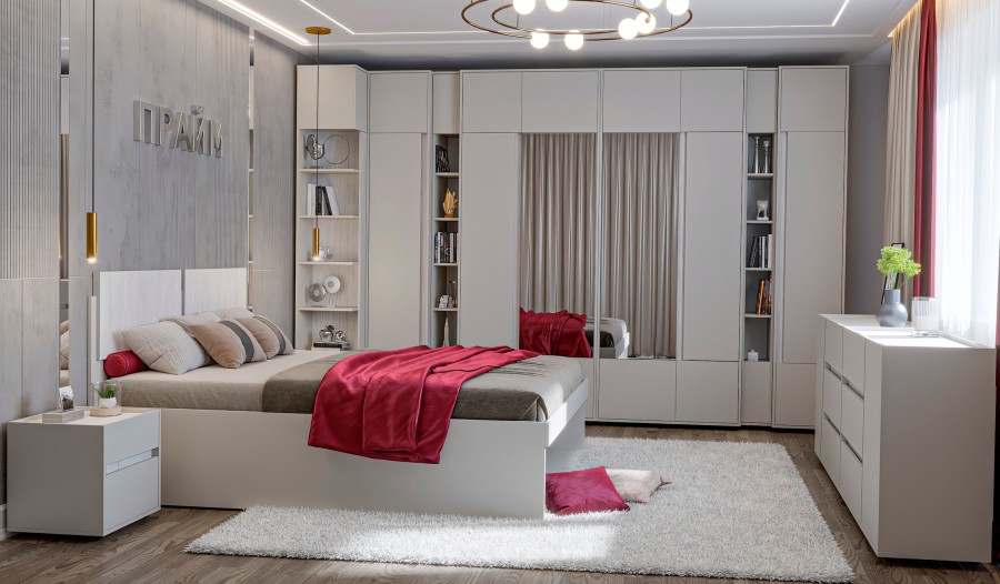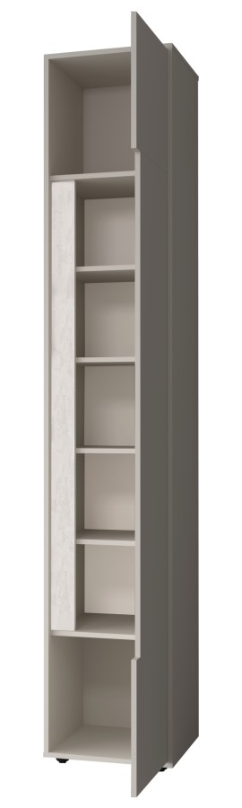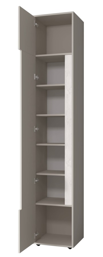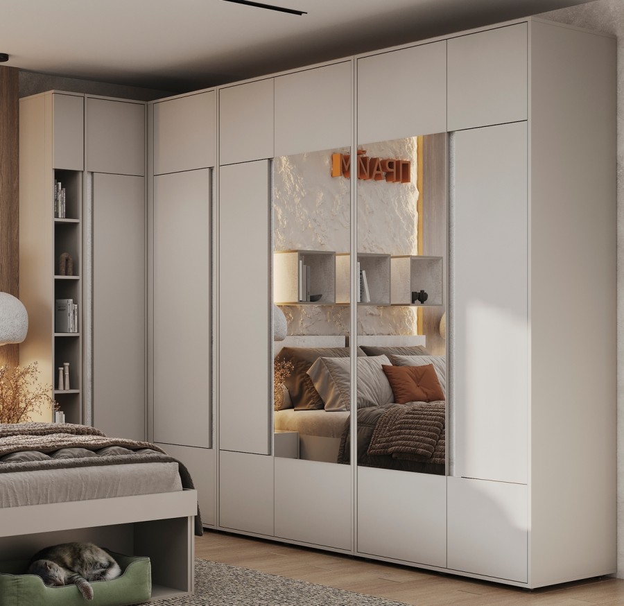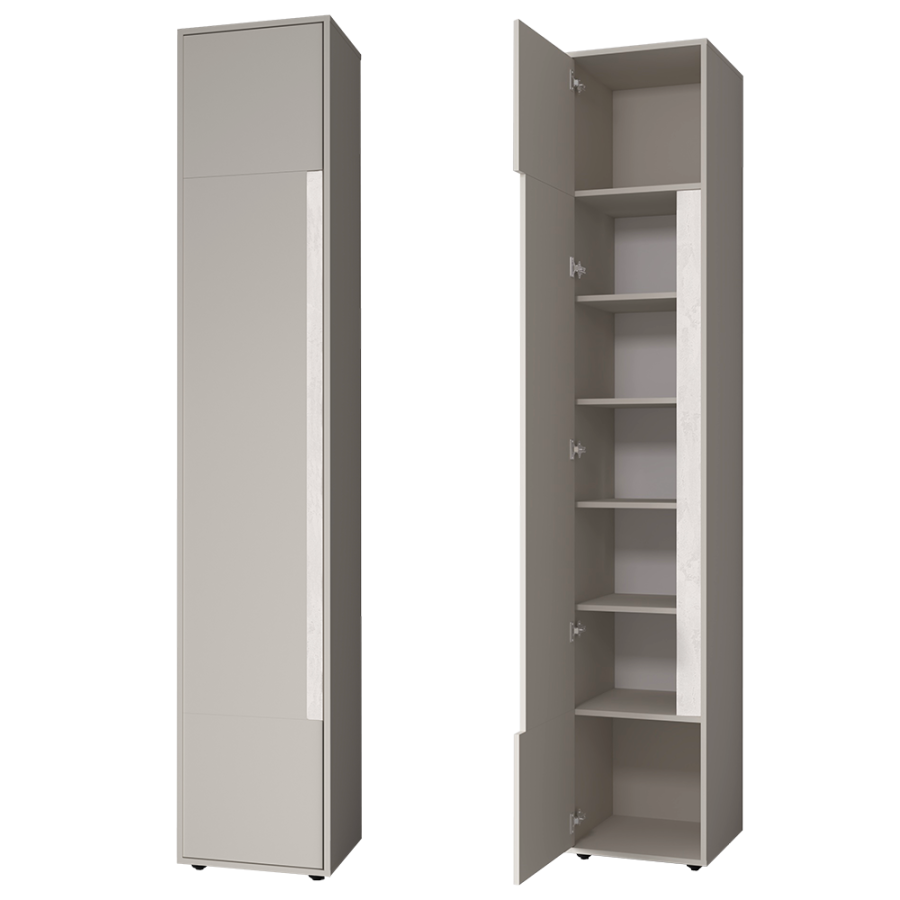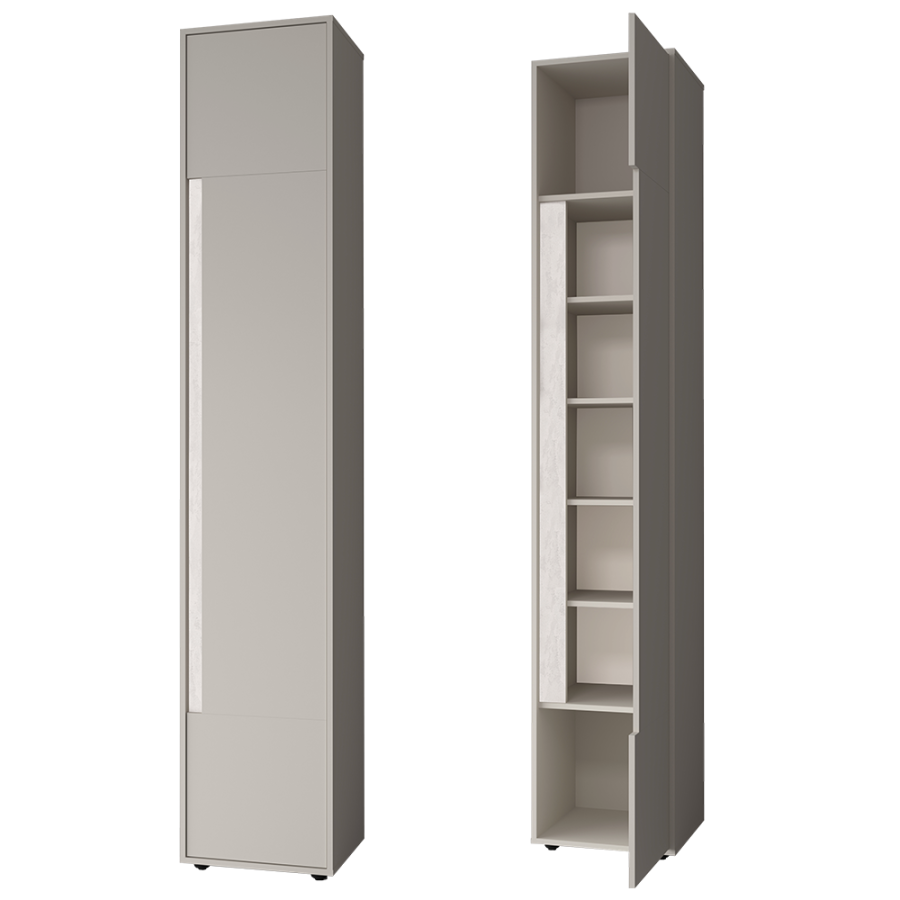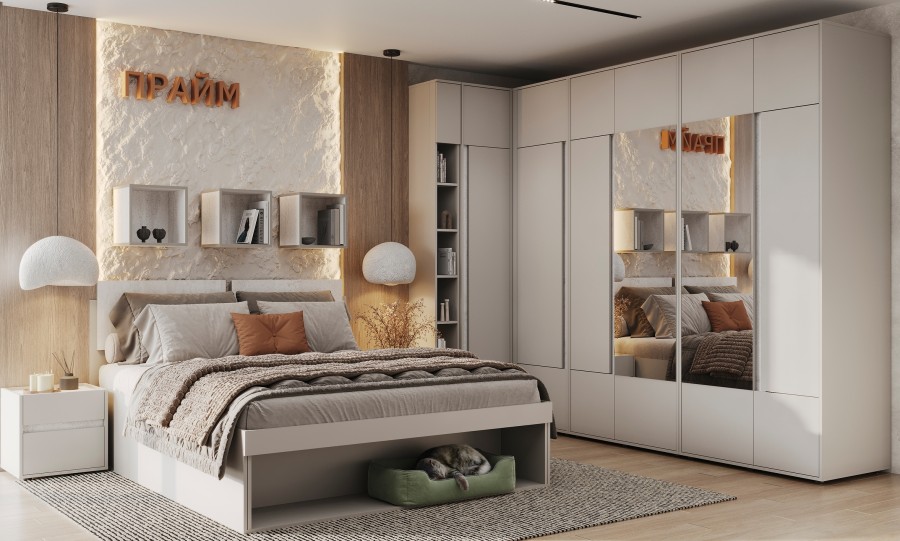 Шкаф гармонично сочетается с другими модулями коллекции «Прайм», создавая единую стилистическую композицию.