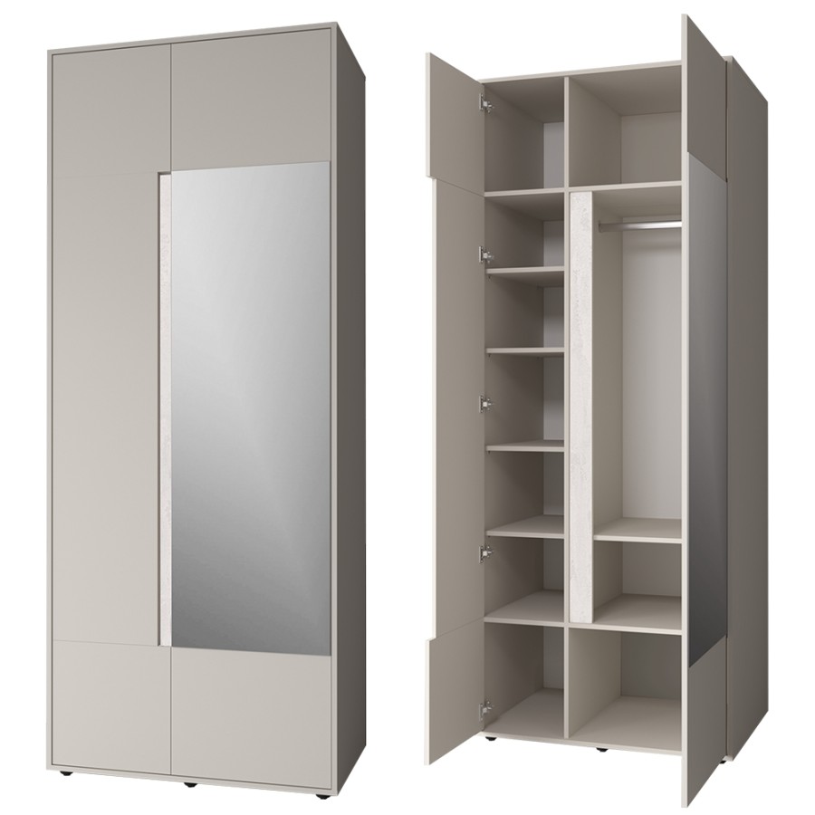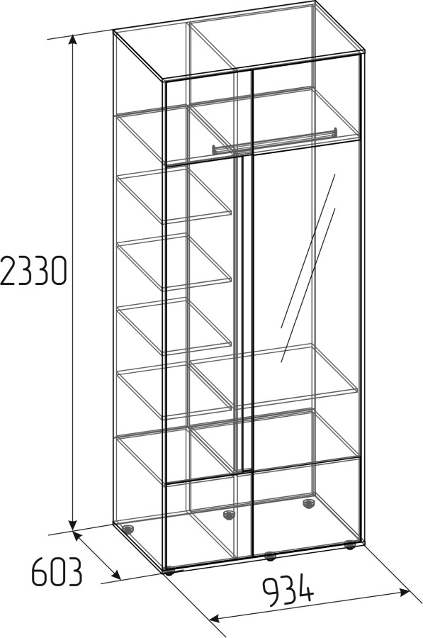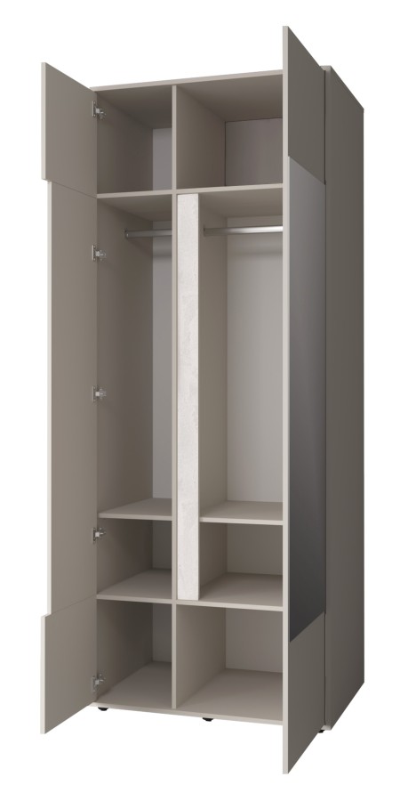В двухдверном шкафу «Прайм» 65 предусмотрено две секции: с полками и со стационарной штангой. Это практичный шкаф, который можно использовать для хранения белья.