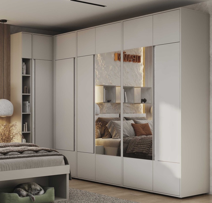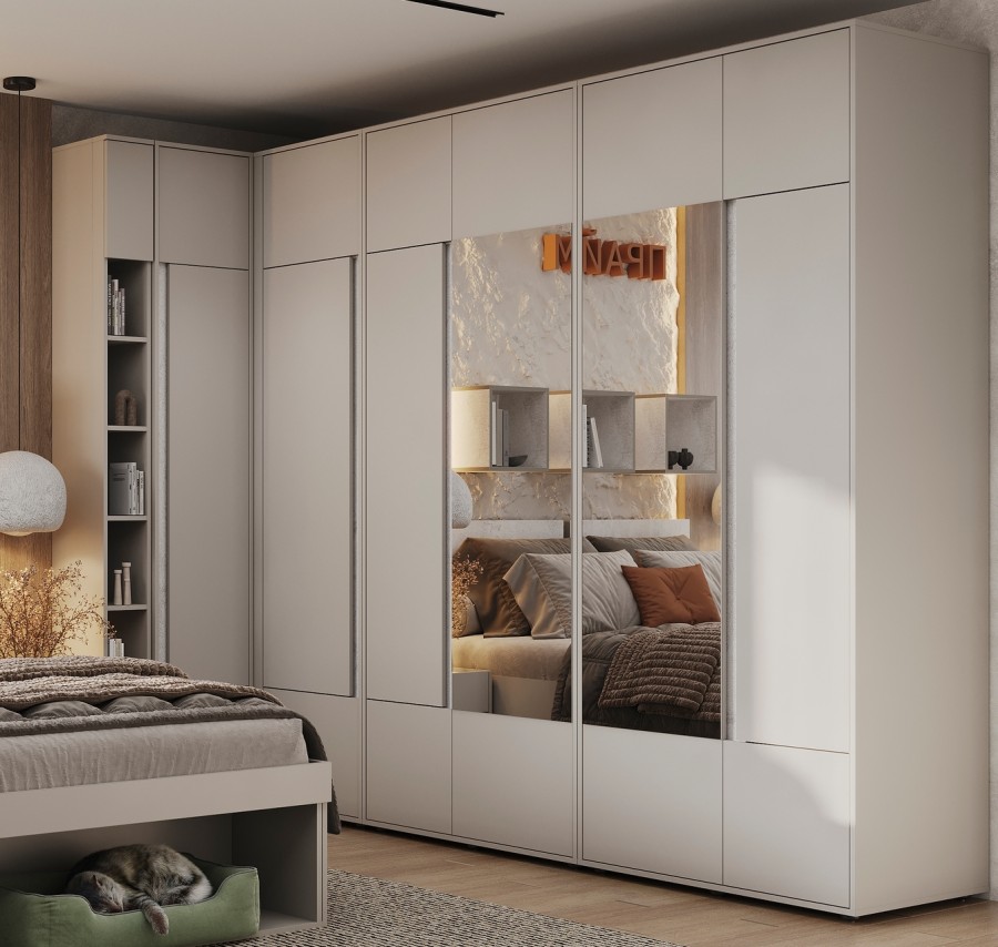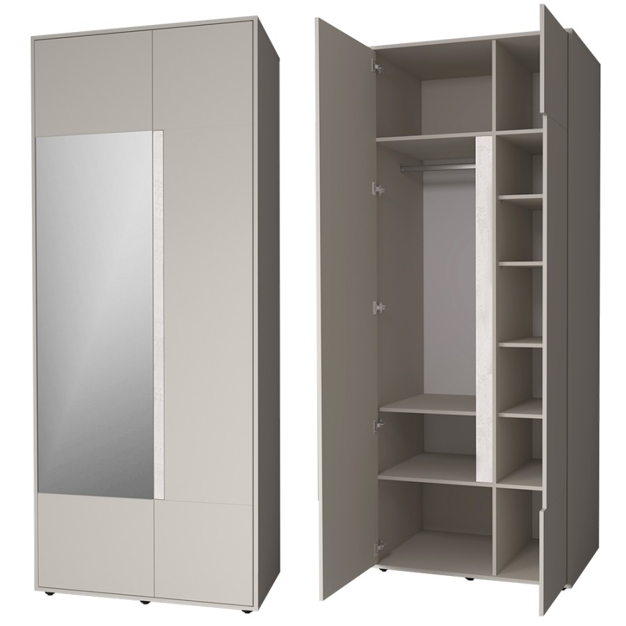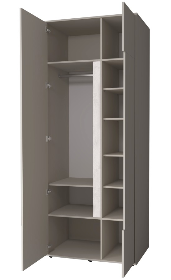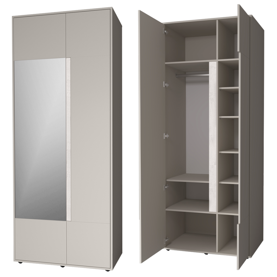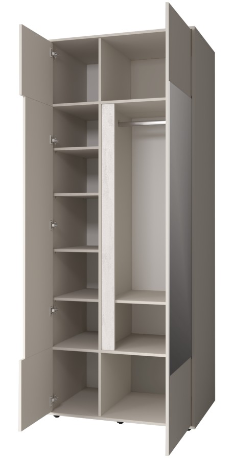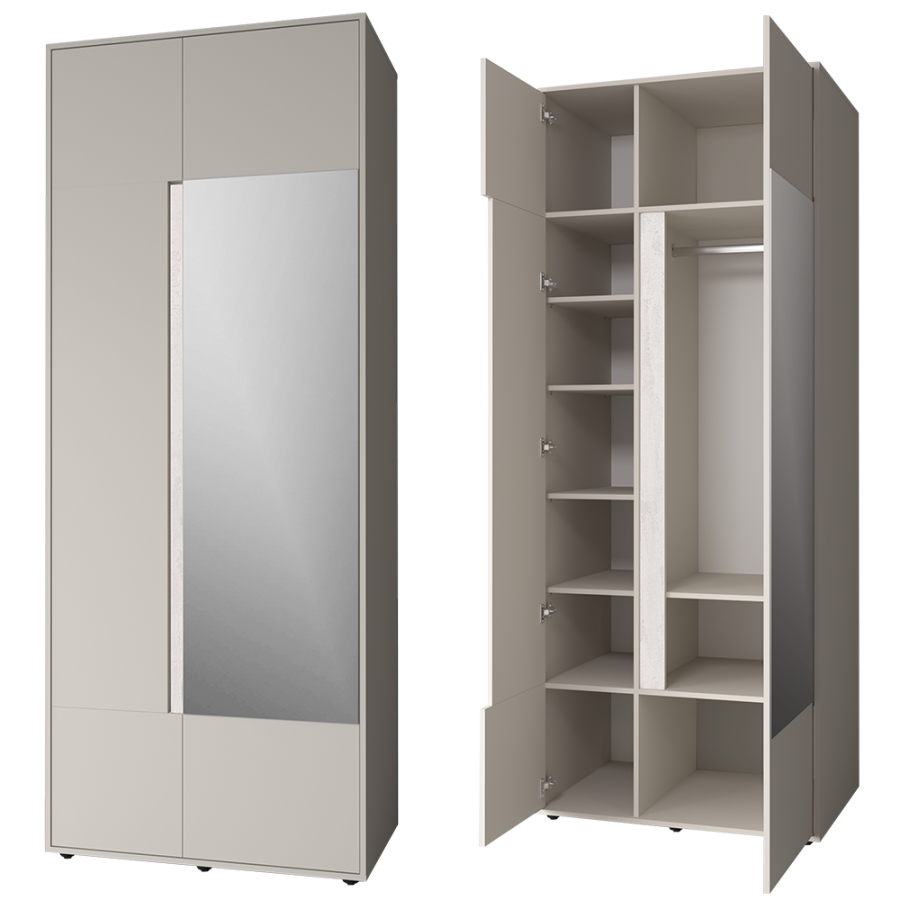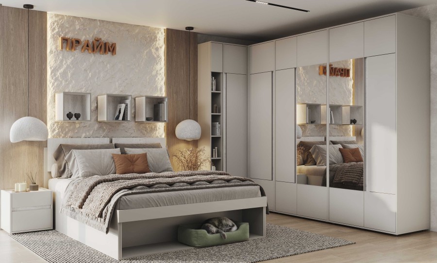 Шкаф гармонично сочетается с другими модулями коллекции «Прайм», создавая единую стилистическую композицию.