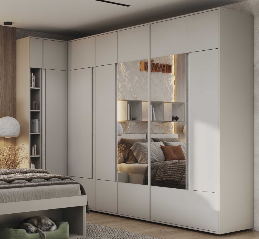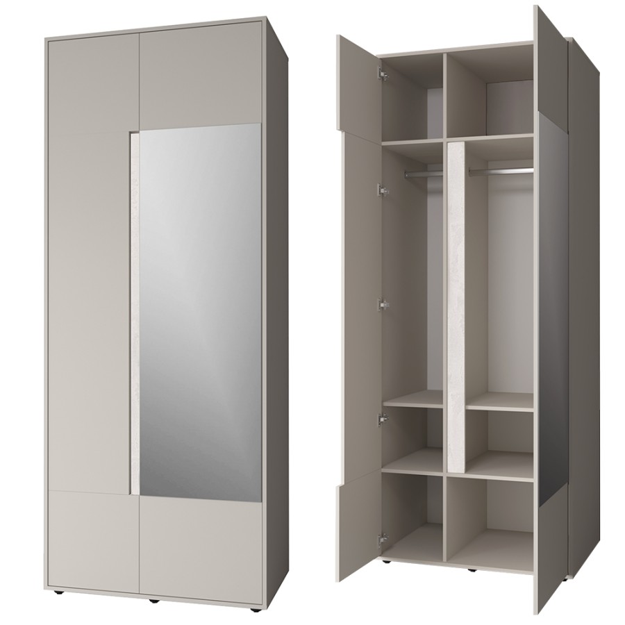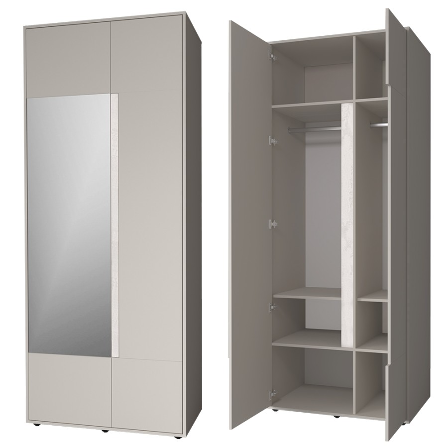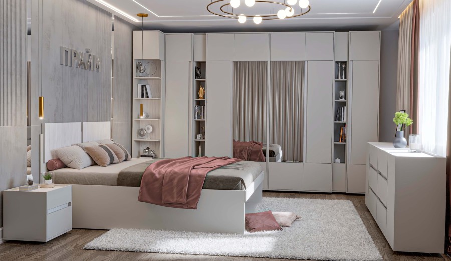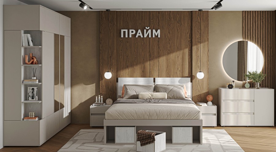 Шкаф гармонично сочетается с другими модулями коллекции «Прайм», создавая единую стилистическую композицию.