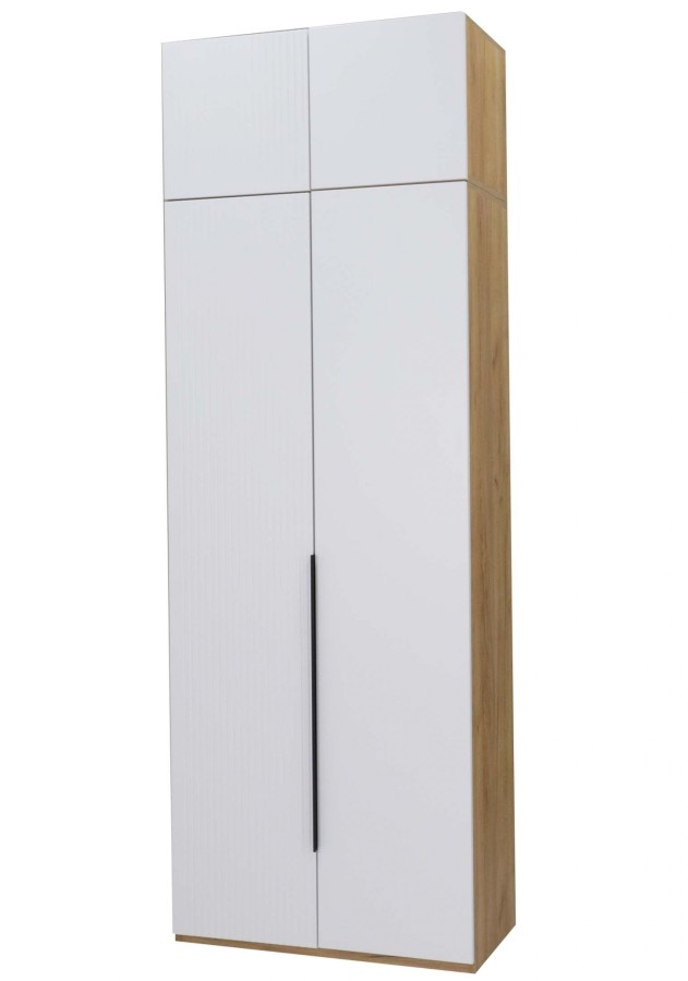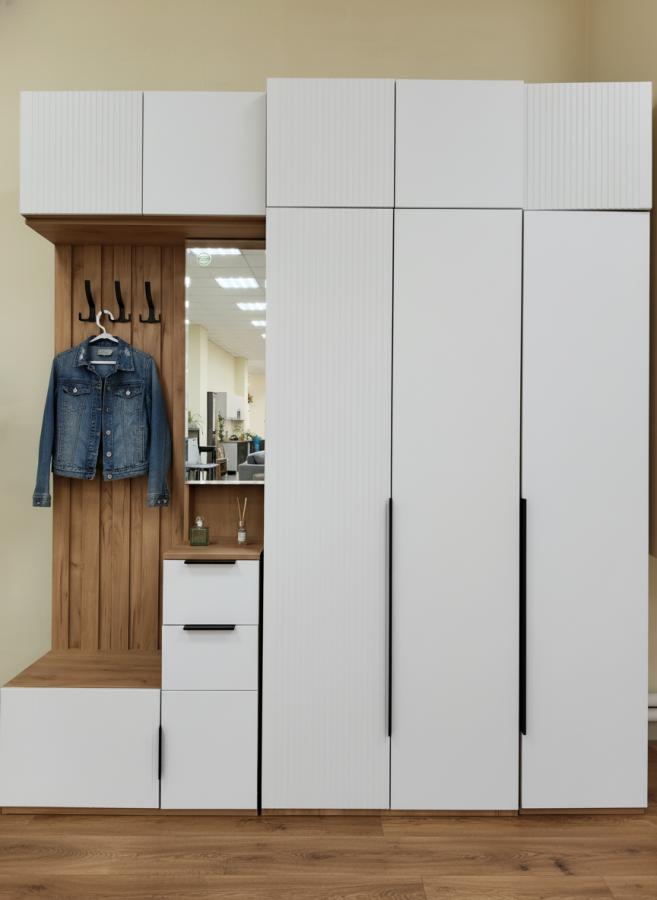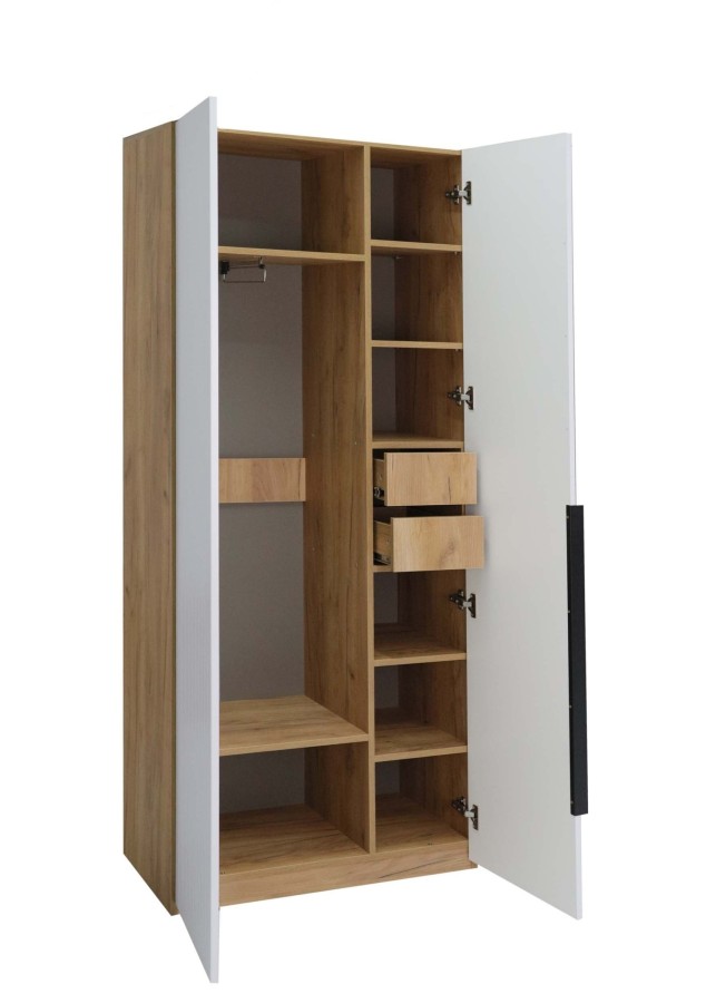 Шкаф 2-х створчатый для прихожей отличается высокой функциональностью, объемным местом для хранения и оригинильным дизайном. В нем предусмотрены выдвижные ящики, полки и место для плечиков. Для увеличения объема хранения можно дополнительно приобрести антресоль Стефани 1.1