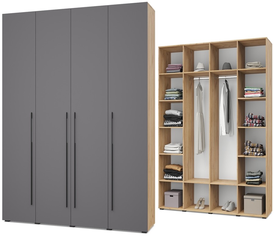 Стоун С41 от Модериум — это четырехстворчатый шкаф для одежды из модульной серии Стоун, выполненный в современном стиле с сочетанием древесных и однотонных цветов: Дуб золотой/Графит, Анкор темный/Анкор светлый, Кашемир, Серый дуб/Белый), имеющий размеры (ШхВхГ) 150х230х52 см.