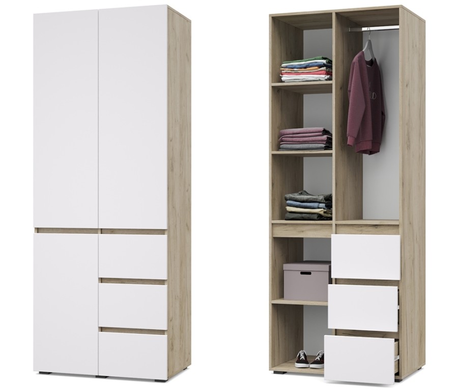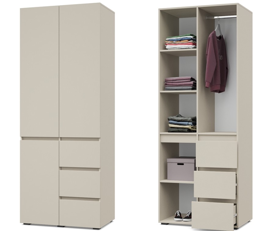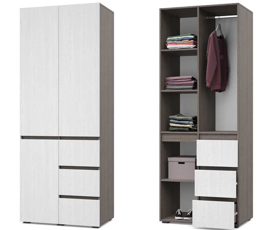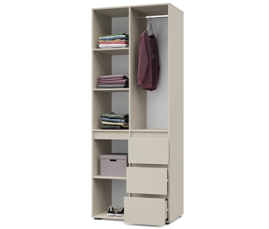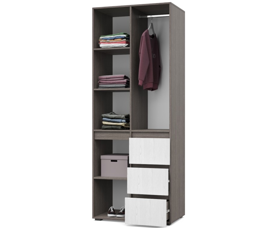 - Шкаф оснащен стационарной металлической штангой, полками, выдвижными ящиками.