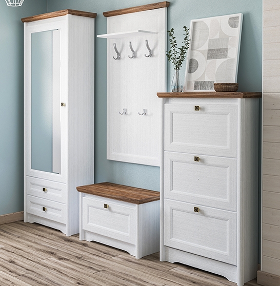 Отличительной чертой стиля «лёгкого кантри» является применение в дизайне не более трёх основных цветов. В качестве основного выступает белый со структурой под дерево, а в противовес ему для создание контраста идёт тёмный цвет с текстурой дуба. Такая универсальная цветовая гамма мебели легко впишется в большинство интерьеров и будет идеальным решением для владельцев любой квартиры или дома.