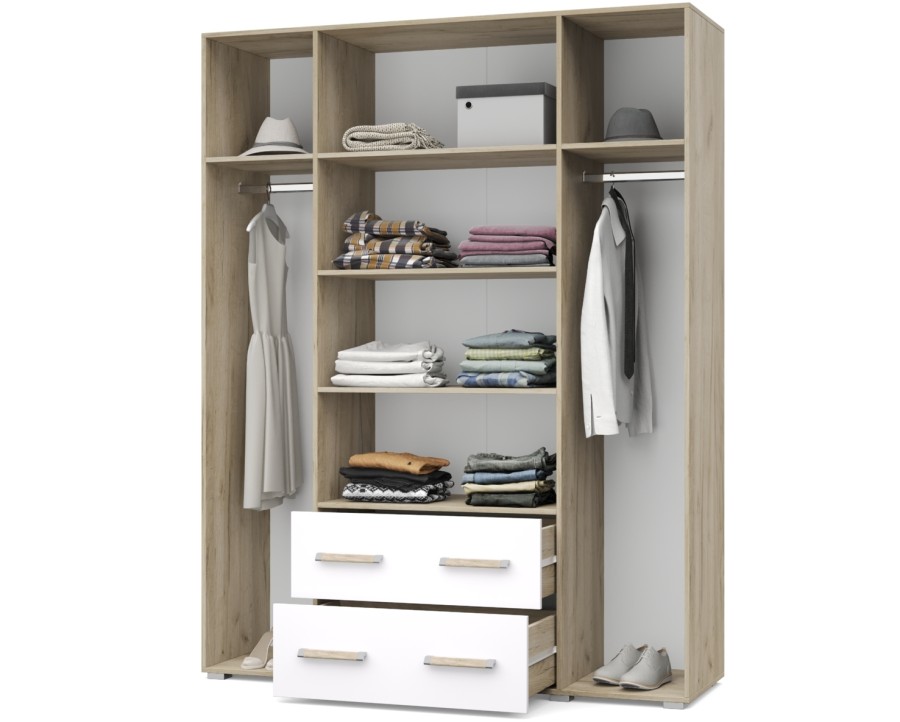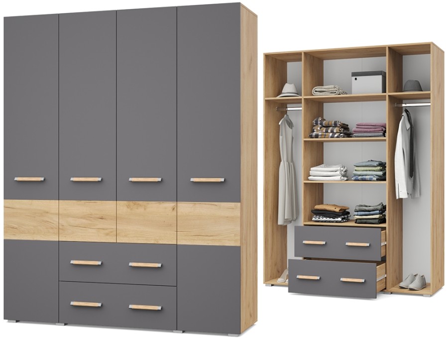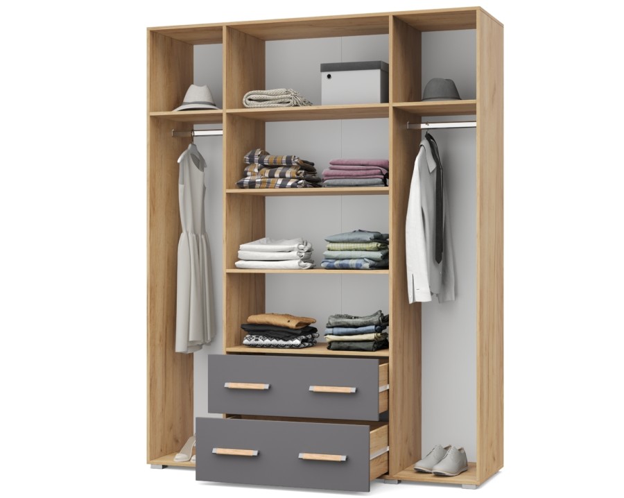 Виора В43 от Модериум — это четырехстворчатый шкаф с полками, стационарной штангой и двуям выувтными ящиками для хранения одежды, белья из модульной серии Виора. Доступен в разных цветах: Дуб золотой/Графит, Дуб серый/Белый, что позволяет выбрать подходящий вариант под Ваш интерьер.