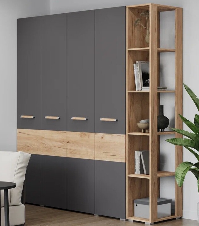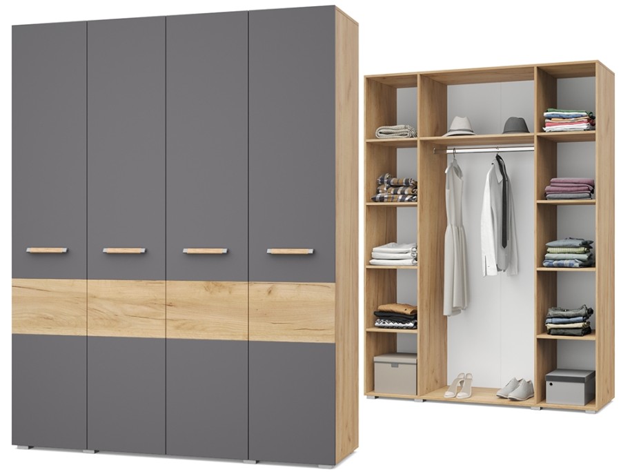 Виора В40 от Модериум — это четырехстворчатый шкаф с полками и стационарной штангой для хранения одежды, белья из модульной серии Виора. Доступен в разных цветах: Дуб золотой/Графит, Дуб серый/Белый, что позволяет выбрать подходящий вариант под Ваш интерьер.