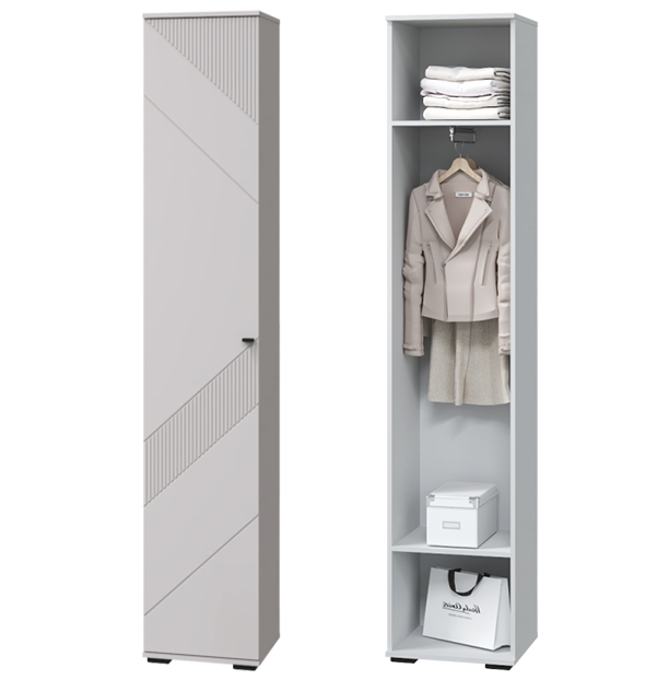 Шкаф "Кашемир" – это компактное и функциональное решение для хранения одежды и белья. Внутри шкафа расположена выдвижная штанга для вешалок, а также несколько полок для хранения сложенной одежды, белья и аксессуаров.