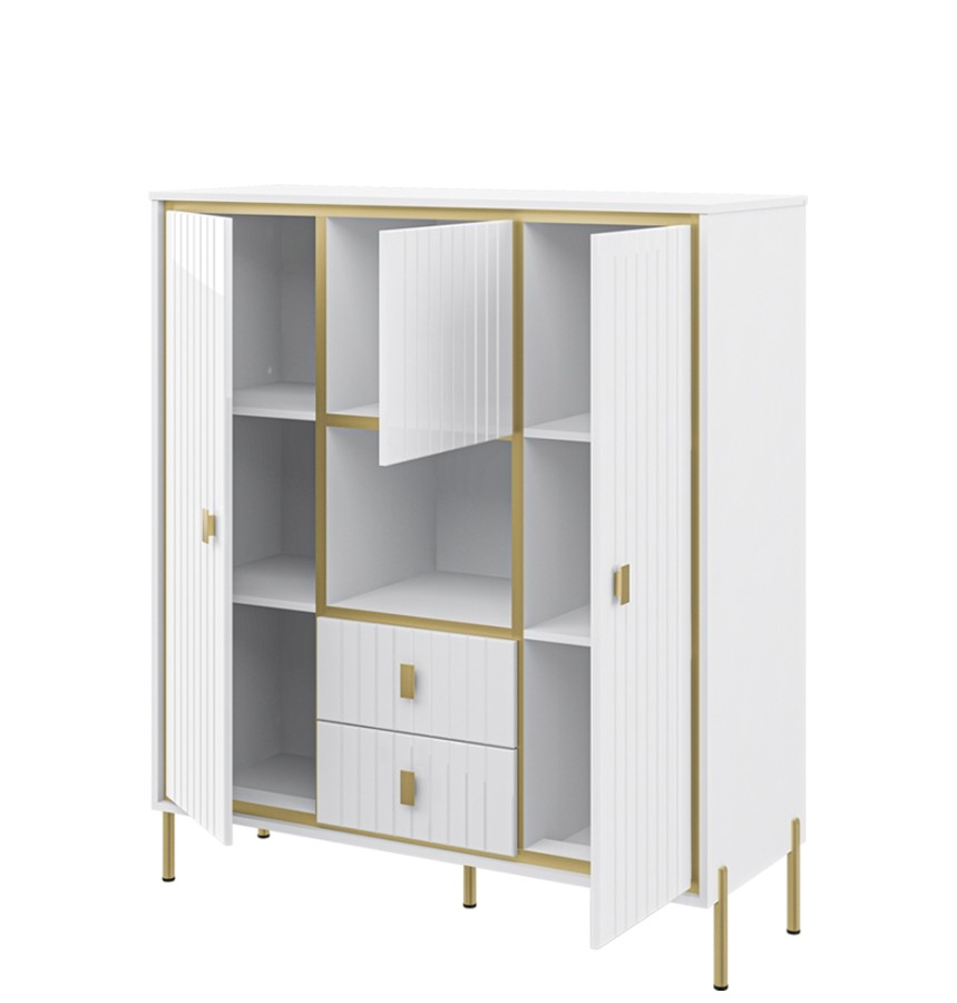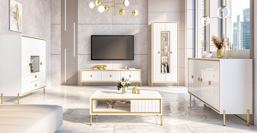Строгая геометрия форм смягчена игривым характером золотой фурнитуры и легкостью прозрачных стеклянных витрин.