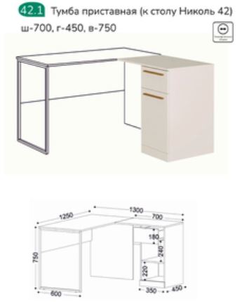 Тумба "Николь 42.1" — дополнительный модуль для хранения. Компактная, надежная, с ящиком, полками. Идеально подходит к столу "Николь 42".