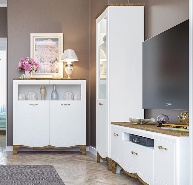 Широкий выбор модулей поможет оформить вам как спальню, так и гостиную. Чистый белый цвет в сочетании с благородной древесной текстурой мебели Тиффани идеально подойдет для интерьера квартиры либо загородного дома создавая гармоничную и уютную атмосферу.