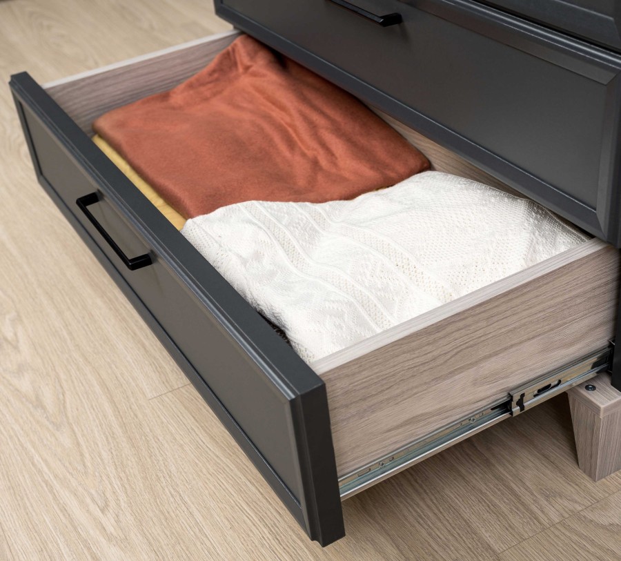 AURELIO 455 Комод - это функциональный элемент интерьера, который помогает правильно организовать пространство и систему хранения. При выборе комода эстетика играет важную роль. Четкая геометрия линий привлекает элегантностью: фасады в тонком профиле МДФ, верх и низ модулей выполнены в древесном декоре. Всё это придаёт комоду легкость и лаконичность. Шариковые направляющие полного выдвижения в ящиках обеспечивают плавный, мягкий, бесшумный ход на протяжении всего срока эксплуатации. Донья ящиков в древесном декоре придают мебели коллекции Aurelio дополнительную эстетику. Комод установлен на опоры МДФ без цоколя. Высота опоры 80 мм - оптимальна для современных моделей роботов-пылесосов.