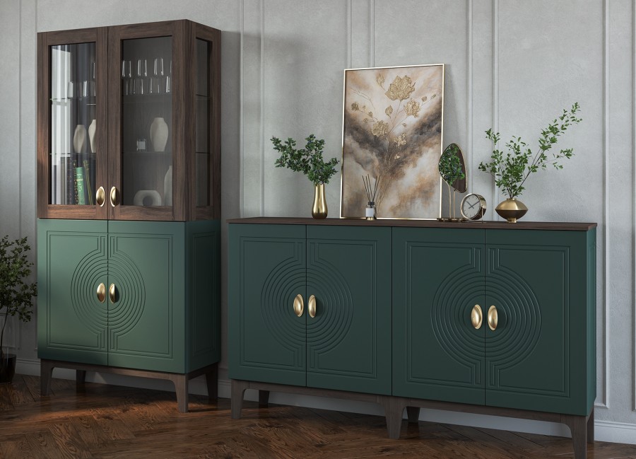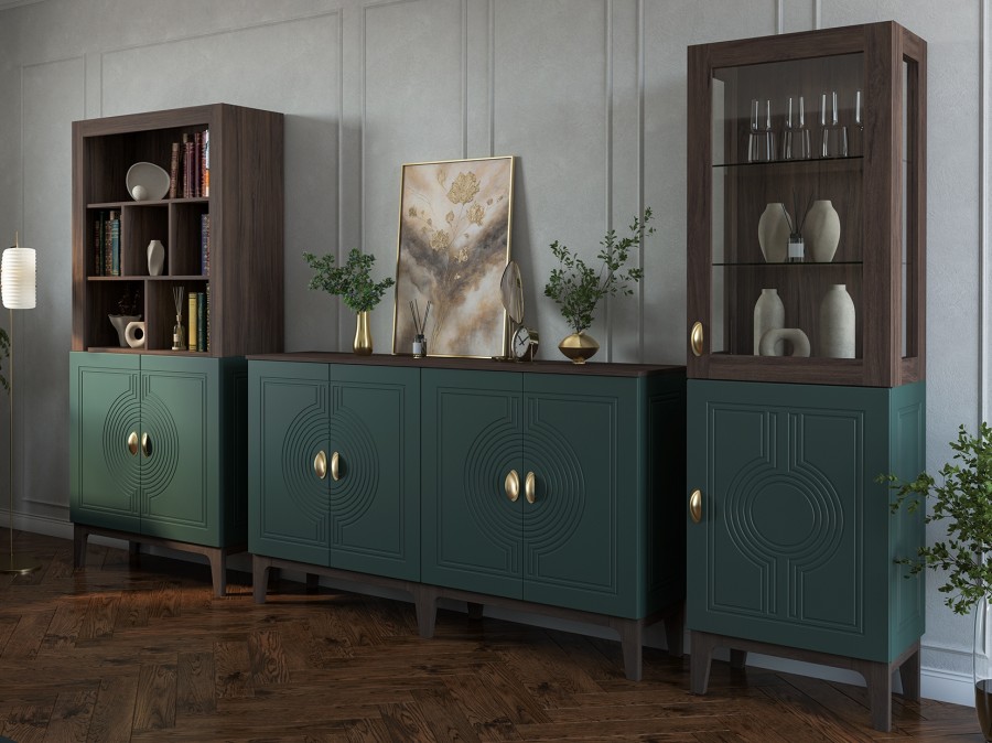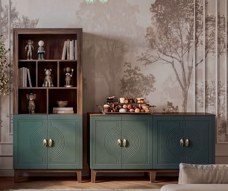 Сочетание насыщенного корпуса Гикори Прадо и акцентного фасада Комбу Грин формирует образ, в котором выразительность встречается с утончённостью. Тёплая древесная текстура наполняет интерьер уютом, а глубокий зелёный фасад придаёт пространству характер и индивидуальность.