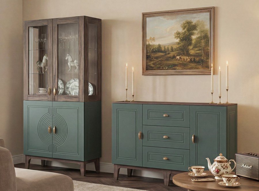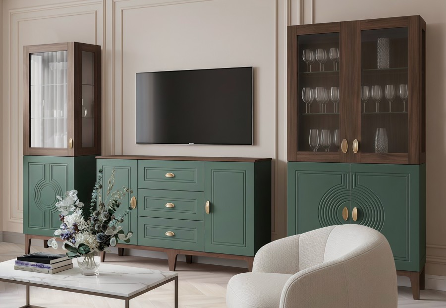 Сочетание насыщенного корпуса Гикори Прадо и акцентного фасада Комбу Грин формирует образ, в котором выразительность встречается с утончённостью. Тёплая древесная текстура наполняет интерьер уютом, а глубокий зелёный фасад придаёт пространству характер и индивидуальность.