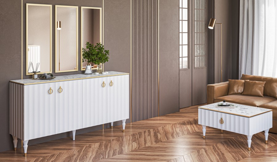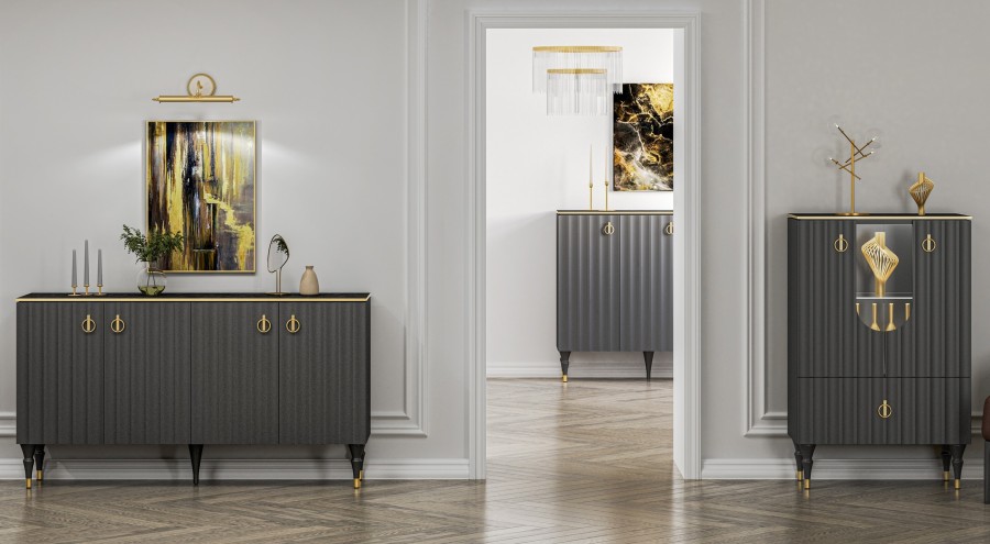 Коллекция мебели Лоренсо – это изысканный дизайн, подчеркнутый золотой металлической линией на изящной столешнице Мрамор Неро Маркина и Мрамор Каррара с фактурой необработанного камня.