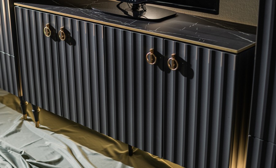 Дизайнерские резные ножки из дерева придают коллекции легкость, а инновационное матовое покрытие от итальянских производителей будто приглашает дотронуться до бархатистой волны фасада и ощутить тепло прикосновения.