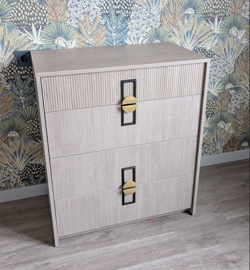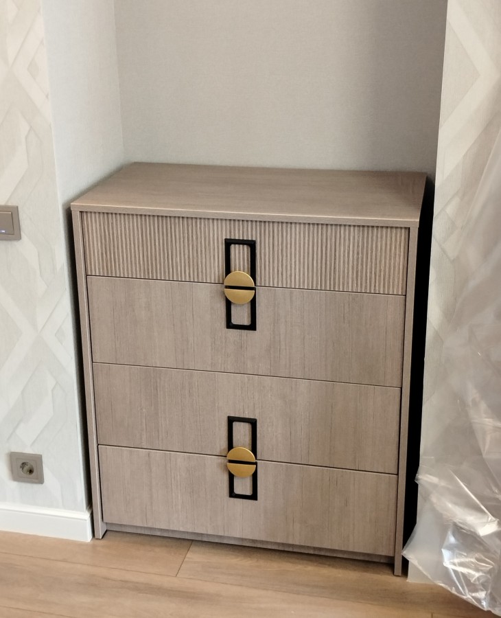 - Лицевая фурнитура: Ручки пластик: кнопка - золото матовое, рамка - черный матовый, в качестве опор (ножек) использованы пластмассовые подпятники.