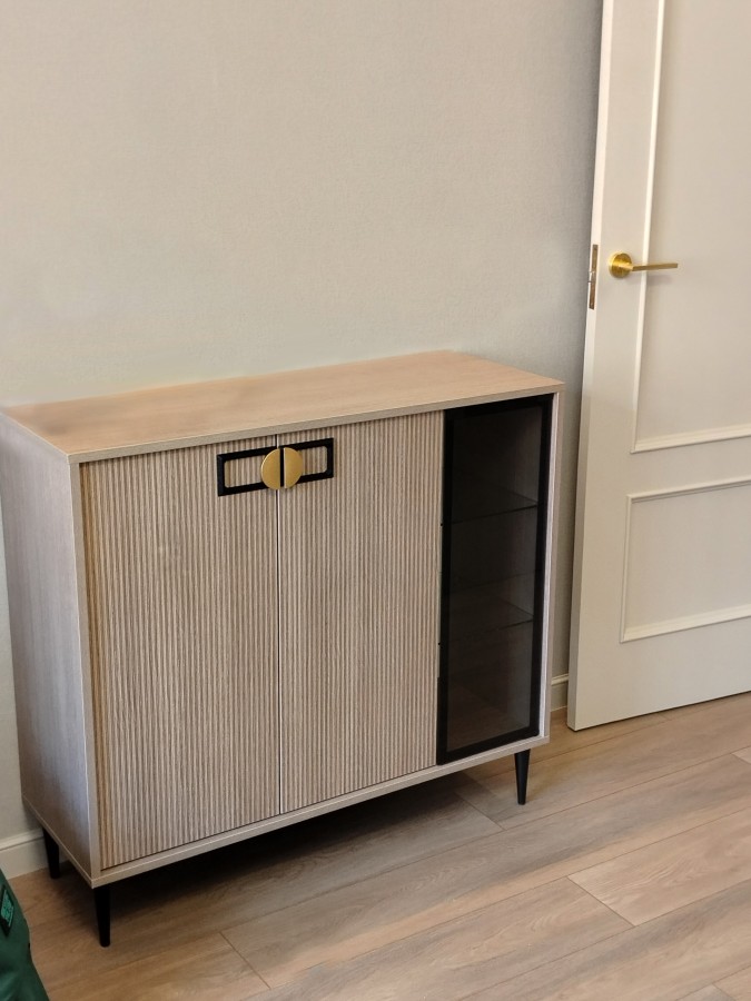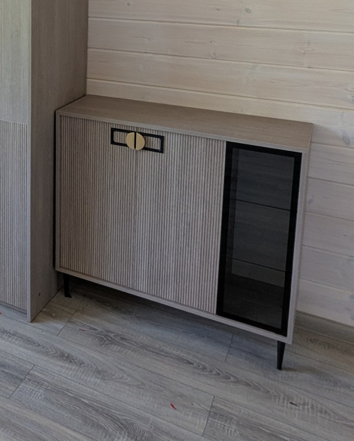 - Материал фасадов ЛДСП 16 мм цвет «Тира» и «Кадена Вуд» и тонированное стекло 4 мм (серое) с печатью в виде рамки.