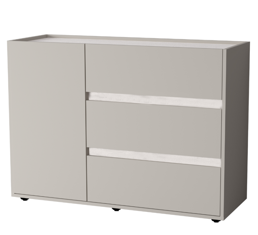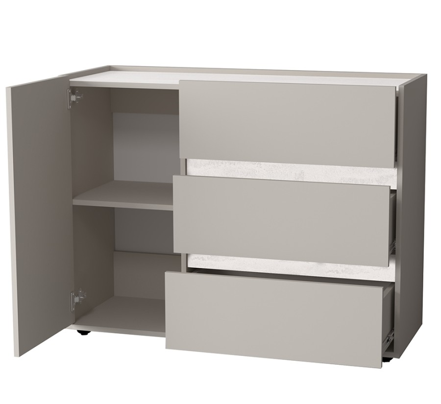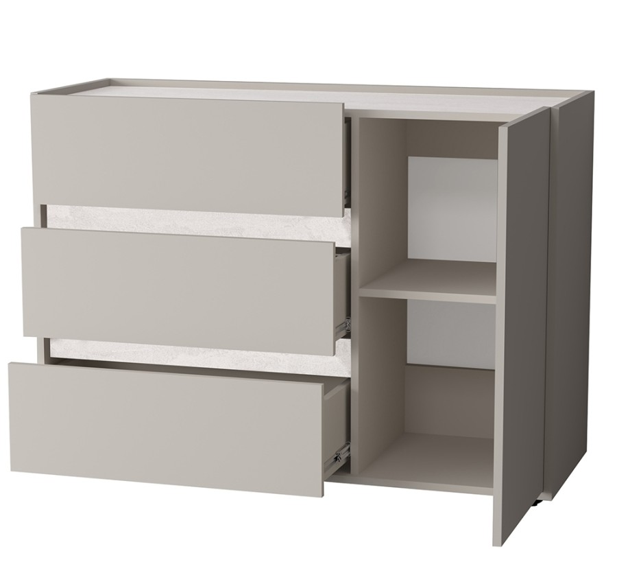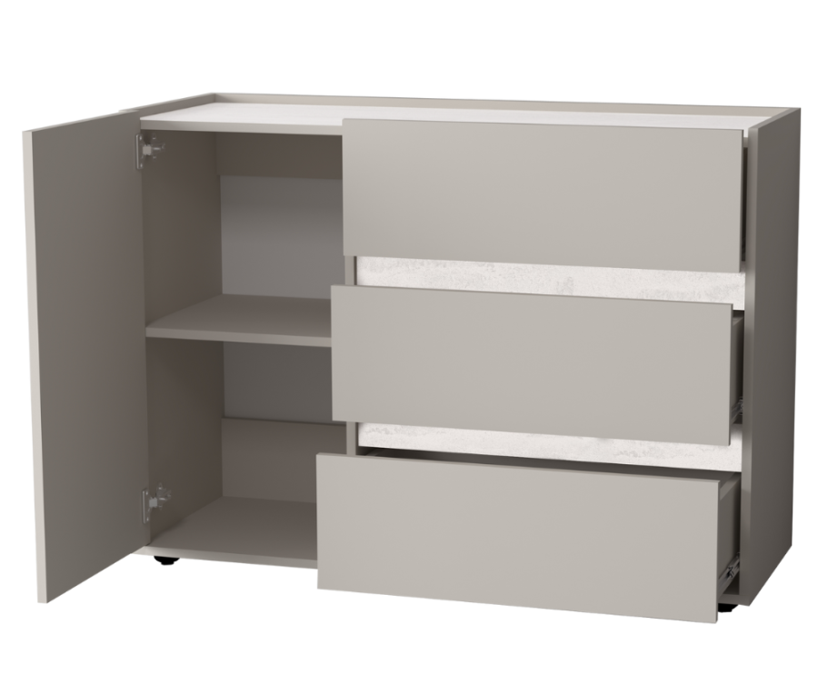 Три вместительных выдвижных ящика на шариковых направляющих обеспечивают лёгкий доступ к содержимому. Дополнительно оснащён отделением с распашной дверцей и полкой.