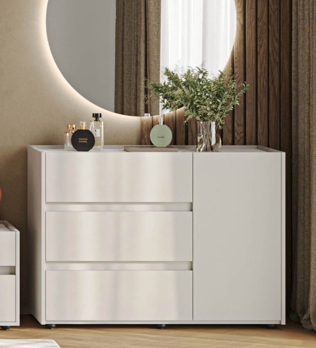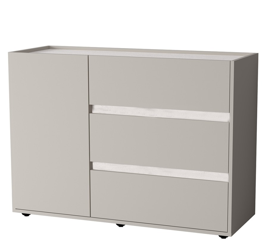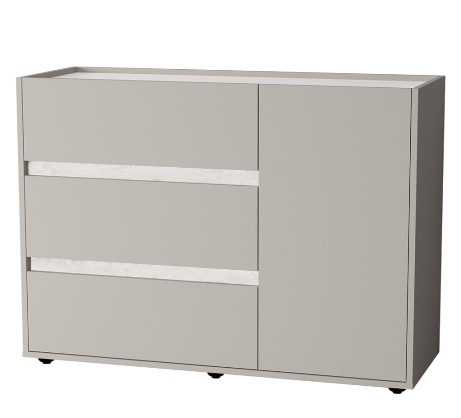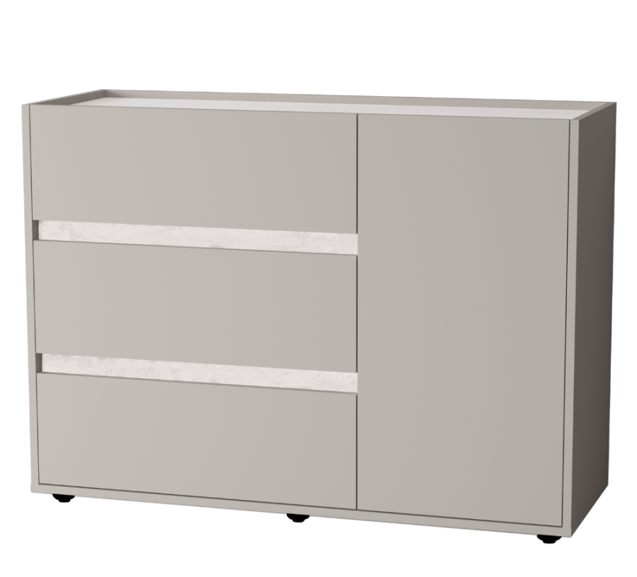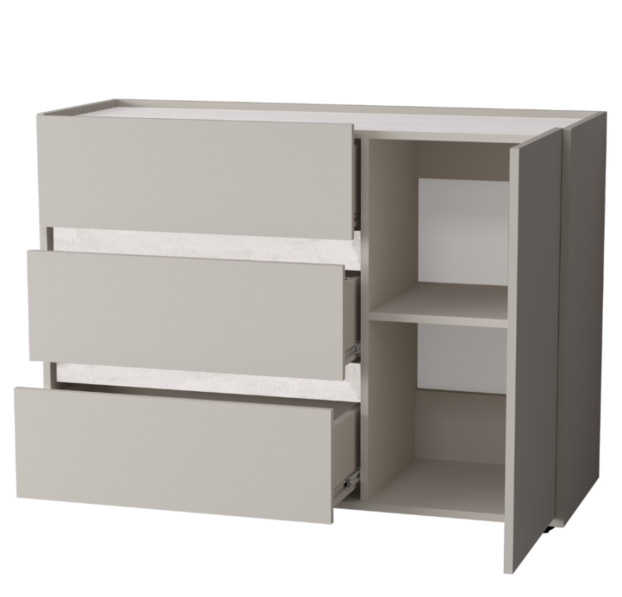 Три вместительных выдвижных ящика на шариковых направляющих обеспечивают лёгкий доступ к содержимому. Дополнительно оснащён отделением с распашной дверцей и полкой.