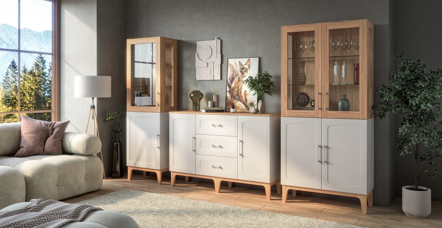 Изящные ножки из массива дерева придают композиции воздушность и визуально расширяют пространство, наполняя его светом. Инновационное матовое покрытие фасадов – это тактильное наслаждение, мягкая бархатистая поверхность, которая словно приглашает прикоснуться. Стеклянные витрины добавляют лёгкость и глубину, создавая эффект простора и ощущение порядка.