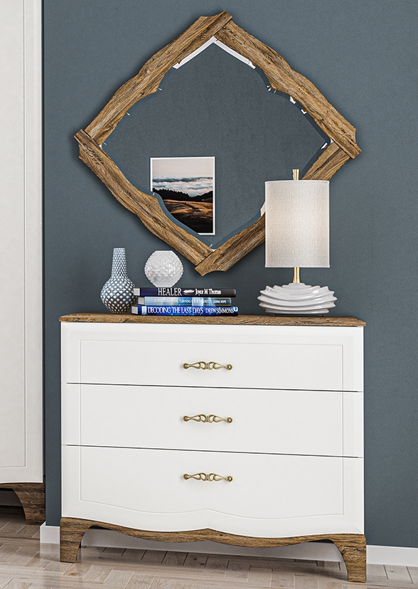 - Материал фасада: крышки тумб и комодов изготовлены из МДФ 22 мм с фрезеровкой по контуру в цвете Дуб Прованс.