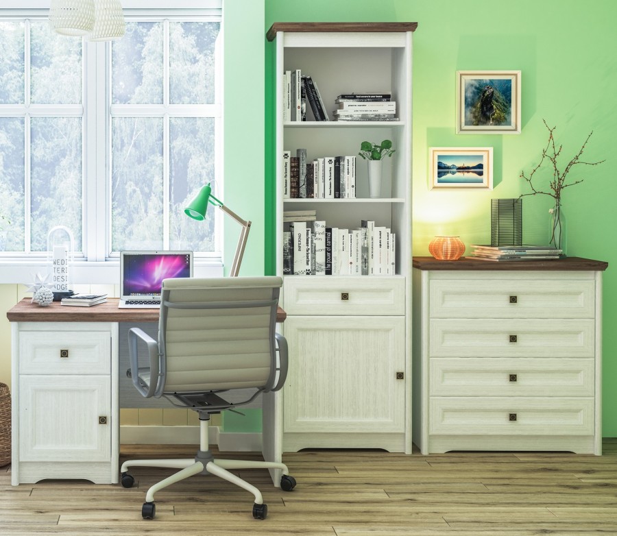 Отличительной чертой стиля «лёгкого кантри» является применение в дизайне не более трёх основных цветов. В качестве основного выступает белый со структурой под дерево, а в противовес ему для создание контраста идёт тёмный цвет с текстурой дуба. Такая универсальная цветовая гамма мебели легко впишется в большинство интерьеров и будет идеальным решением для владельцев любой квартиры или дома.