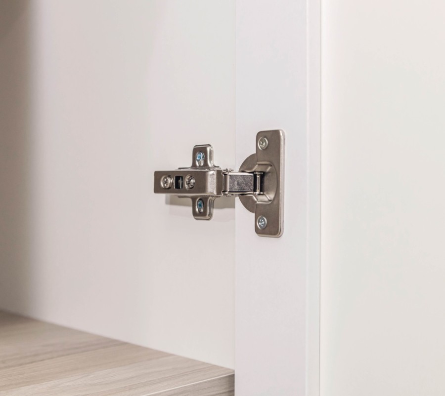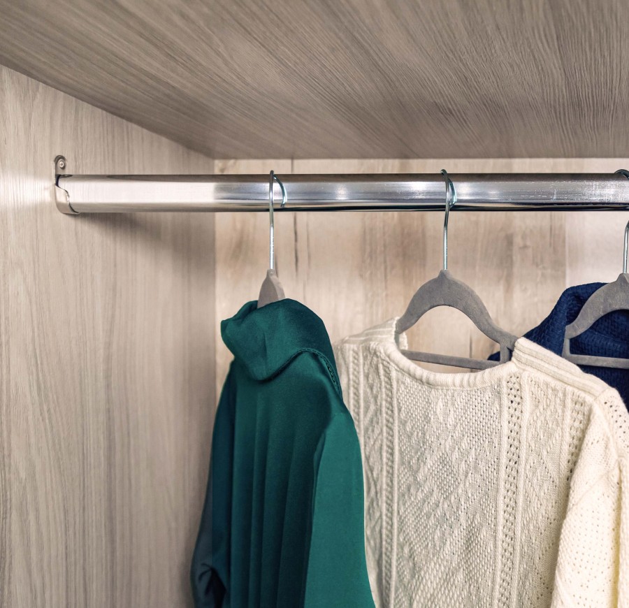 Угловой шкаф с распашным фасадом на петлях Hettich с углом открывания 95 градусов оснащён полкой и продольной стационарной штангой.