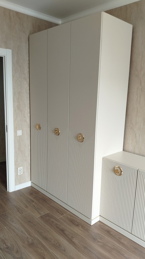 Модульная линейка выпускается в сочетании таких фактур как ЛДСП «сатин», МДФ в плёнке ПВХ с матовой бархатистой поверхностью в цвете «сатин». Изголовье кровати выполнено с применением микровелюра цвета «айвори», ткань обработана по технологии wet proof благодаря чему не боится влаги. Фасады украшены фрезеровкой в виде вертикальных строгих линий и эффектными ручками в цвете золото. По периметру основания корпус оформлен кромкой в цвете «глянцевое золото», которая служит дополнительным декором и подчеркивает четкие грани мебели. Массивный цоколь придает изделиям надежный и основательный вид.