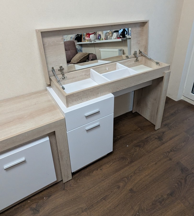- Корпус ЛДСП 16 мм в декоре «Дуб Сакраменто» и фасад МДФ 16 мм в декоре «Белый снег»