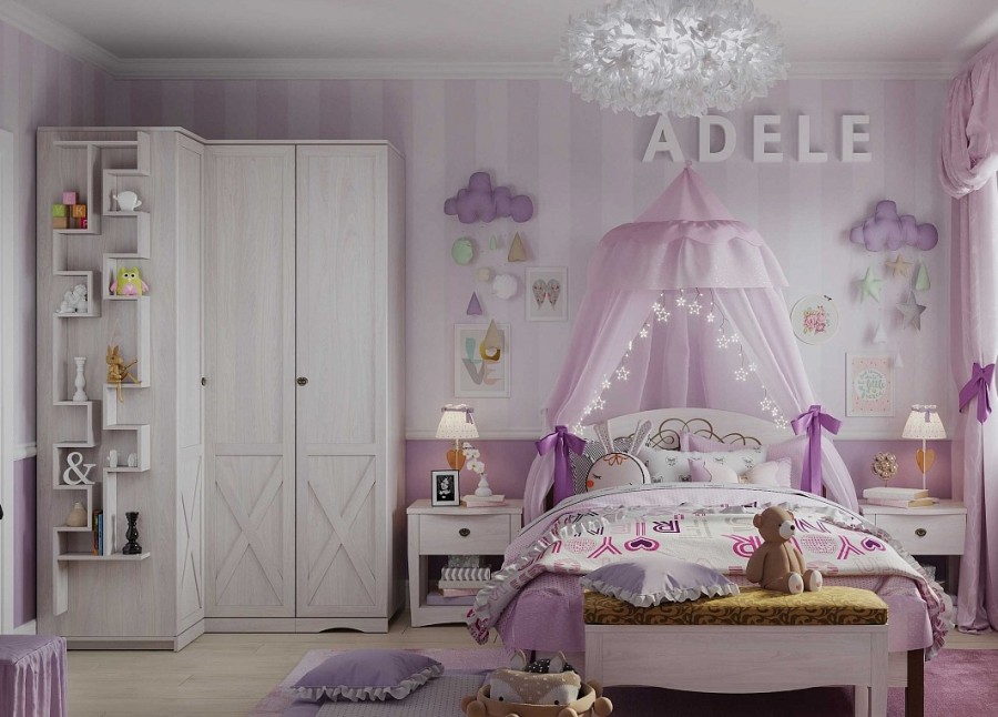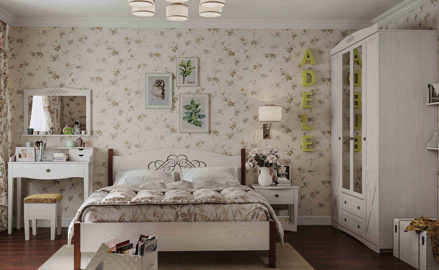 - Одной из отличительных особенностей коллекции ADELE являются виньетки на изголовье кроватей, зеркале и карнизах, выполненные методом ультрафиолетовой печати. Это гарантирует экологичность и стойкость к истиранию.