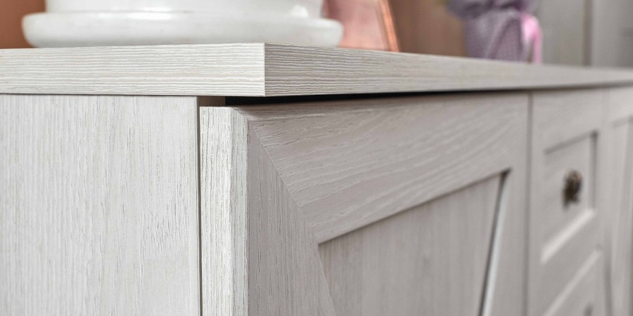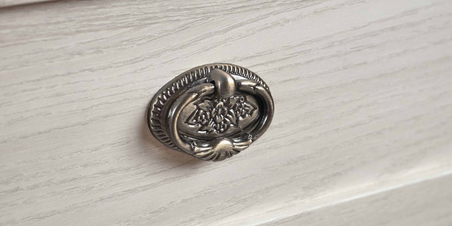 - Ручки на модулях цвета античной бронзы с затейливым цветочным узором прекрасно дополняют нежный стиль, в котором выполнена спальня ADELE.