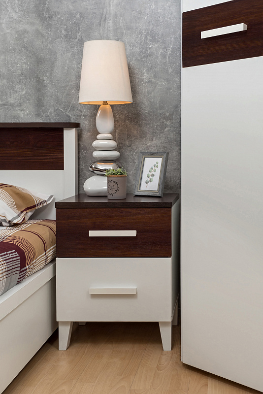 Спальня Норвуд - фаворит среди любителей классики в современном исполнении. Декор, сочетание белого с орехом шоколадным, делает мебель стильной, а помещение - светлым и визуально просторным. Коллекция представлена базовым набором модулей комбинируя которые между собой, Вы сможете создать уютную и функциональную спальню. Вместительные шкафы со стеклянными дверцами, комфортабельные кровати размером от 140 до 180 см в ширину, прикроватная тумба на ножках, широкий комод и туалетный столик-трансформер позволят Вам грамотно обустроить спальную зону и хранить все Ваши вещи, занимая при этом минимум места.