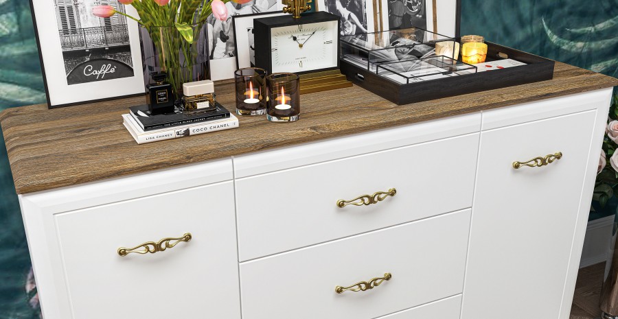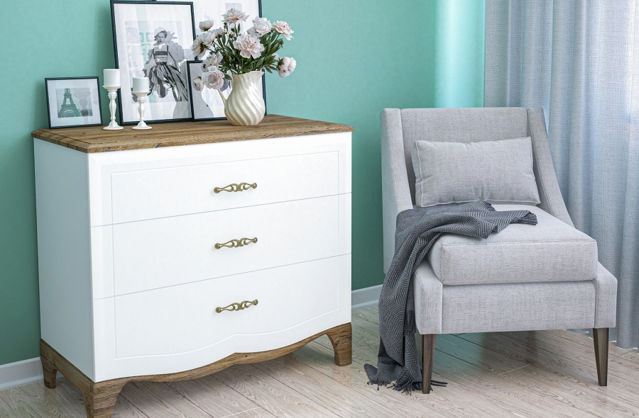 - Материал фасада: крышки тумб и комодов изготовлены из МДФ 22 мм с фрезеровкой по контуру в цвете Дуб Прованс.