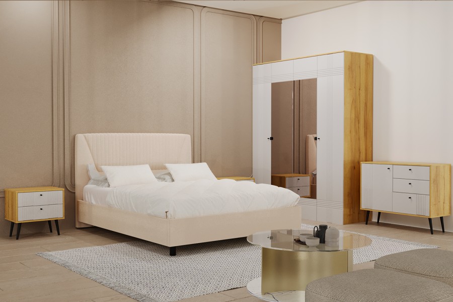 Спальный гарнитур «Вега Саксония» Дуб золотистый/Миндаль поможет обустроить светлую и уютную обстановку с запоминающимися деталями. Набор подходит как для небольшой, так и просторной комнаты, а также хорошо сочетается с интерьерами в разной цветовой гамме. Фрезеровка подчеркивает строгие линии фасадов, придавая обстановке индивидуальность. Кровать с мягким изголовьем создает прекрасные условия для отдыха.