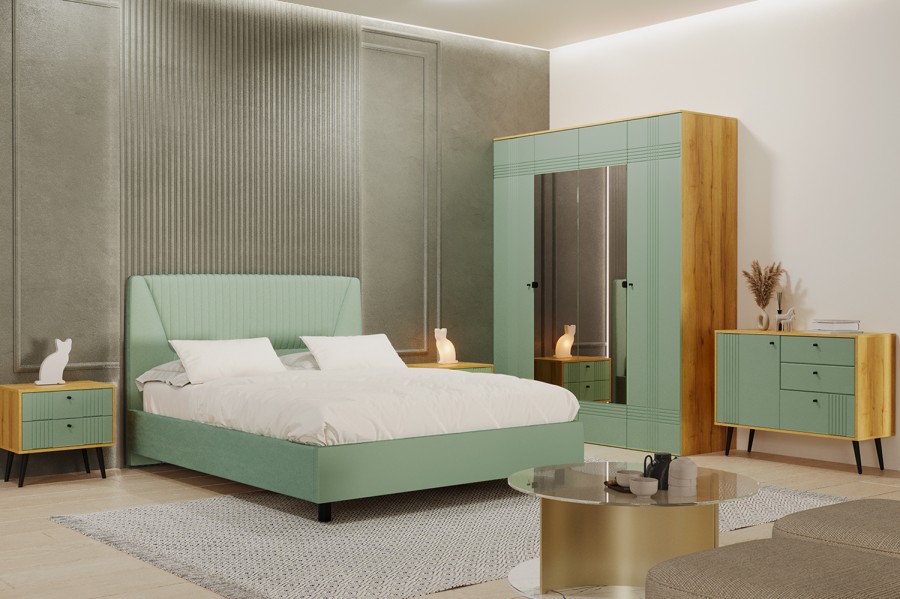 Спальный гарнитур «Вега Саксония» Дуб золотистый/Серо-зеленый поможет обустроить светлую и уютную обстановку с запоминающимися деталями. Набор подходит как для небольшой, так и просторной комнаты, а также хорошо сочетается с интерьерами в разной цветовой гамме. Фрезеровка подчеркивает строгие линии фасадов, придавая обстановке индивидуальность. Кровать с мягким изголовьем создает прекрасные условия для отдыха.