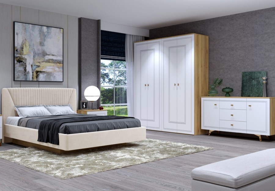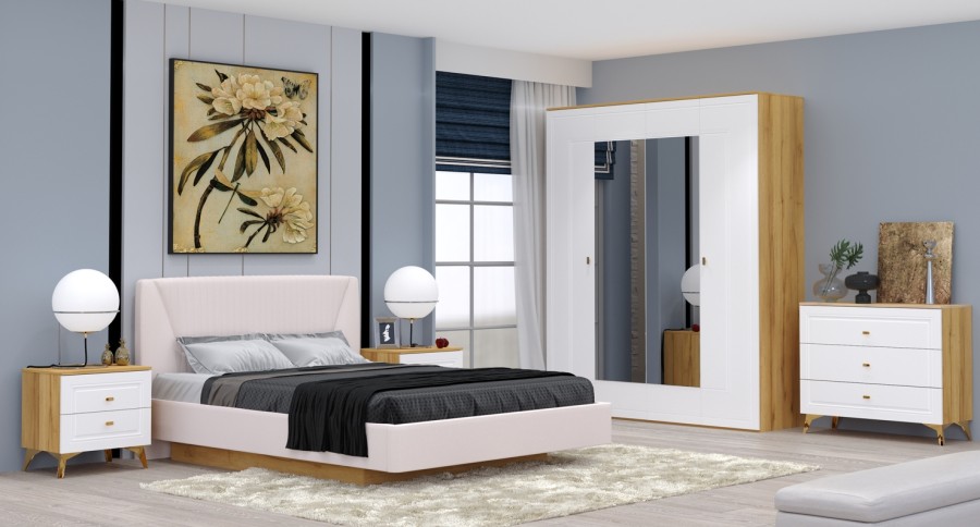 Спальный гарнитур «Вега Сапфир» Дуб золотистый/Белый глянец поможет обустроить светлую и уютную обстановку с запоминающимися деталями. Набор подходит как для небольшой, так и просторной комнаты, а также хорошо сочетается с интерьерами в разной цветовой гамме. Фрезеровка подчеркивает строгие линии фасадов, придавая обстановке индивидуальность. Кровать с мягким изголовьем создает прекрасные условия для отдыха.