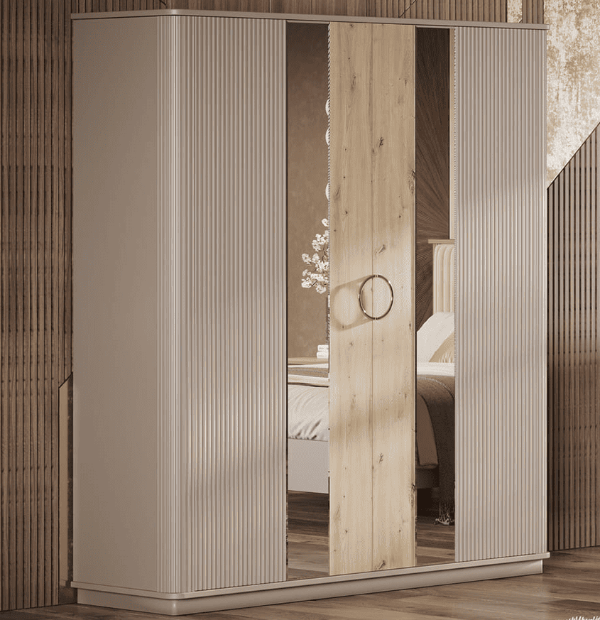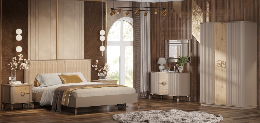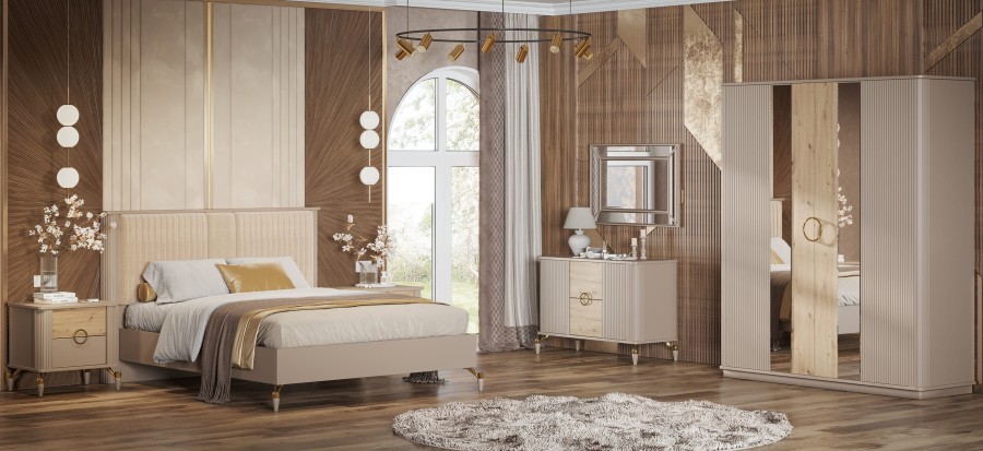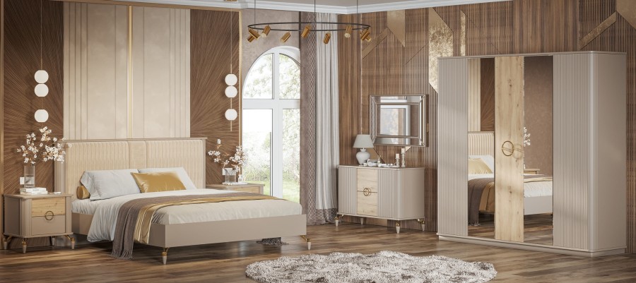 Спальный гарнитур «Мадрид» – для тех, кто предпочитает современные и минималистичные решения в интерьере. Нежные оттенки в сочетании с деревянными элементами, создают в интерьере неповторимую теплую атмосферу. Такой стиль отлично будет смотреться в интерьере любого стиля.Фрезерованные фасады добавляют изысканности и придают мебели утончённый вид.