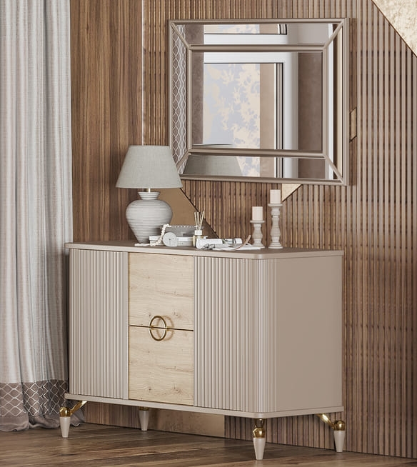 - Вертикальная фрезеровка на фасадах, вставки с деревянной текстурой, металлизированные вставки на ножках (золото).
