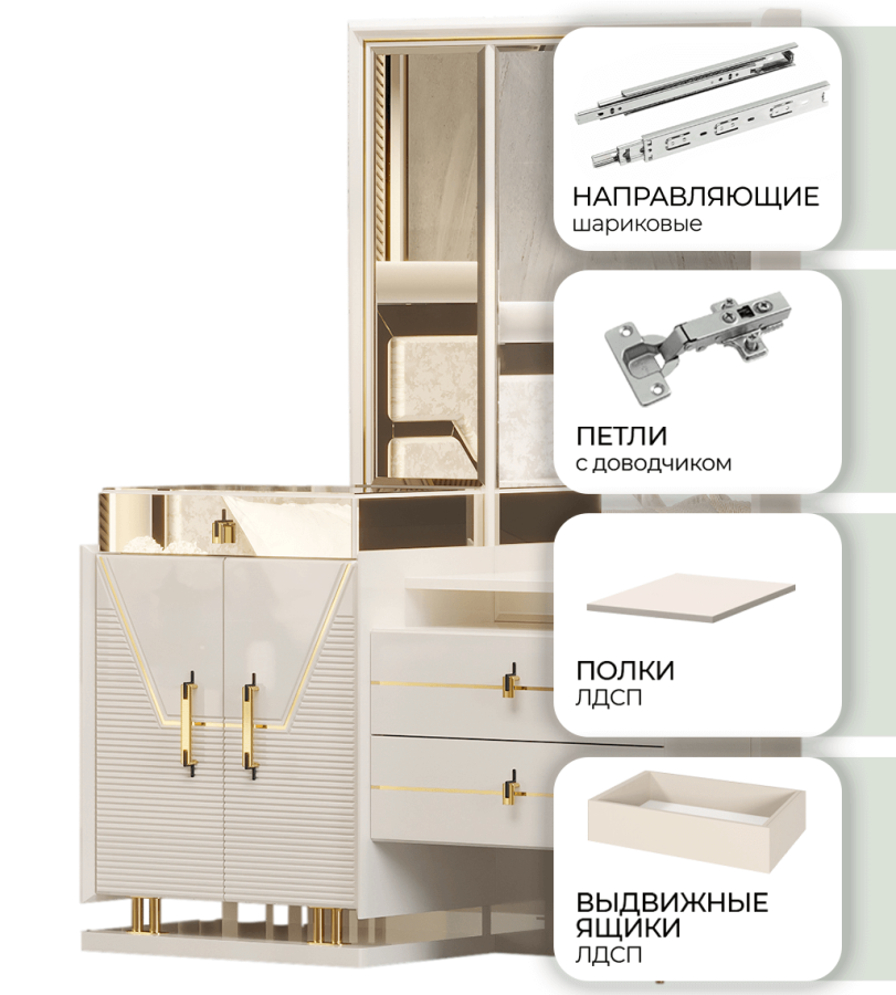 - Крышка/Столешница: зеркальная вставка. МДФ толщиной 22 мм (древесноволокнистая плита среднего уровня плотности, класс E1 - безопасен для здоровья).